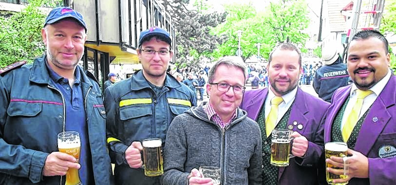 Maichingen: 27 Feuerwehrleute haben den 16 Meter hohen Maibaum vor dem Bürgerhaus aufgestellt