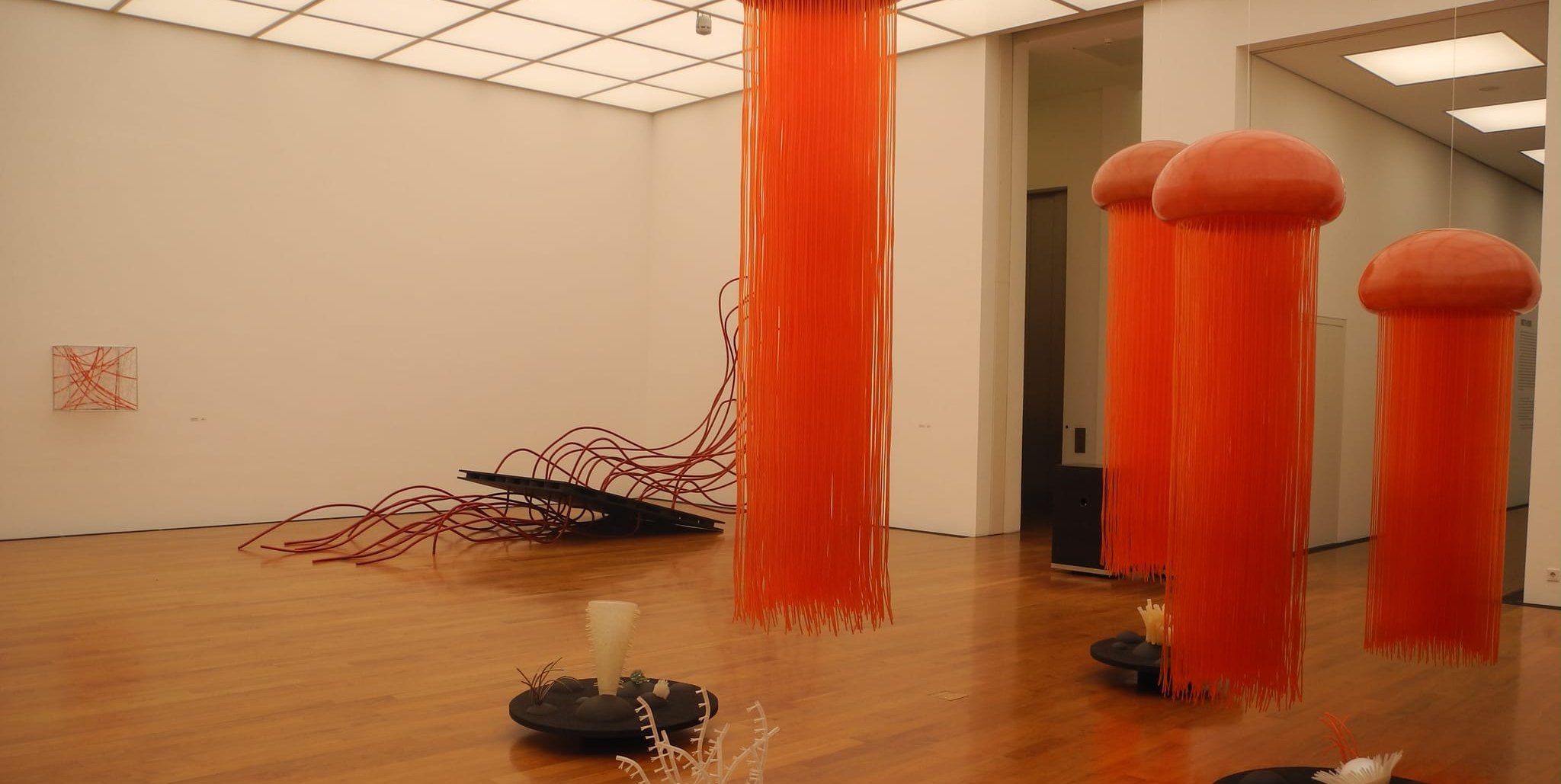 Waldenbuch. Vier überdimensionierte Quallen aus Glasfaserkunststoff mit bis zu 250 Zentimeter langen Tentakeln in einem leuchtenden Korallenrot sind der Blickfang im Kunstmuseum Ritter. Es sind Objekte ...