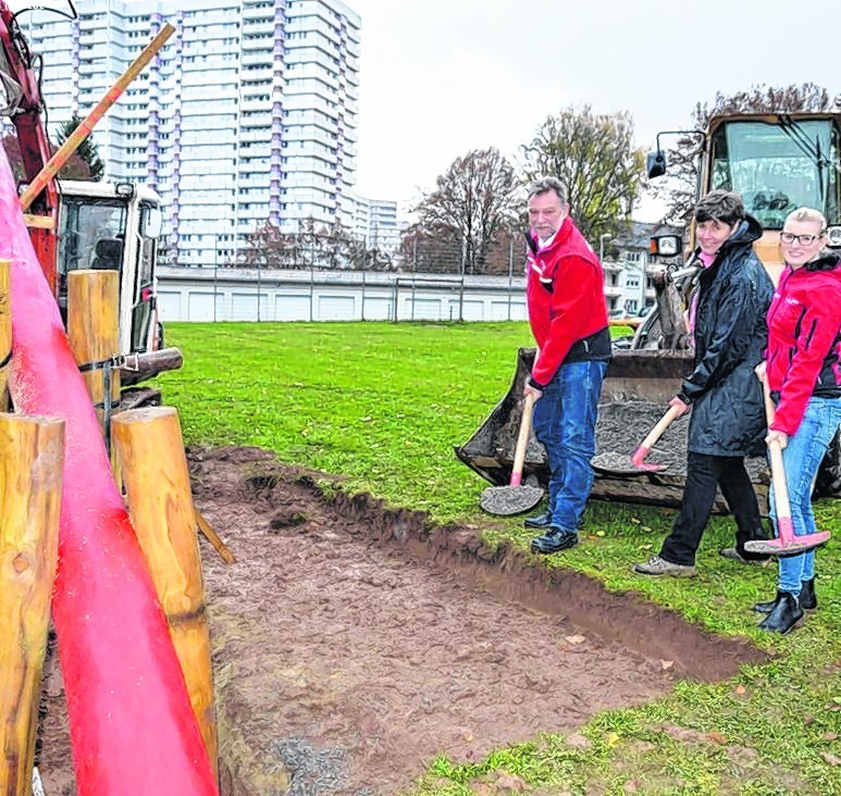 Dank der Spendenaktion der Firma Scholpp Kran und Transport GmbH zu ihrem 60-jährigen Bestehen ist der Kinderspielplatz in der Trettachstraße jetzt um einen roten Schaukelkran reicher. Zum Spatenstich ...