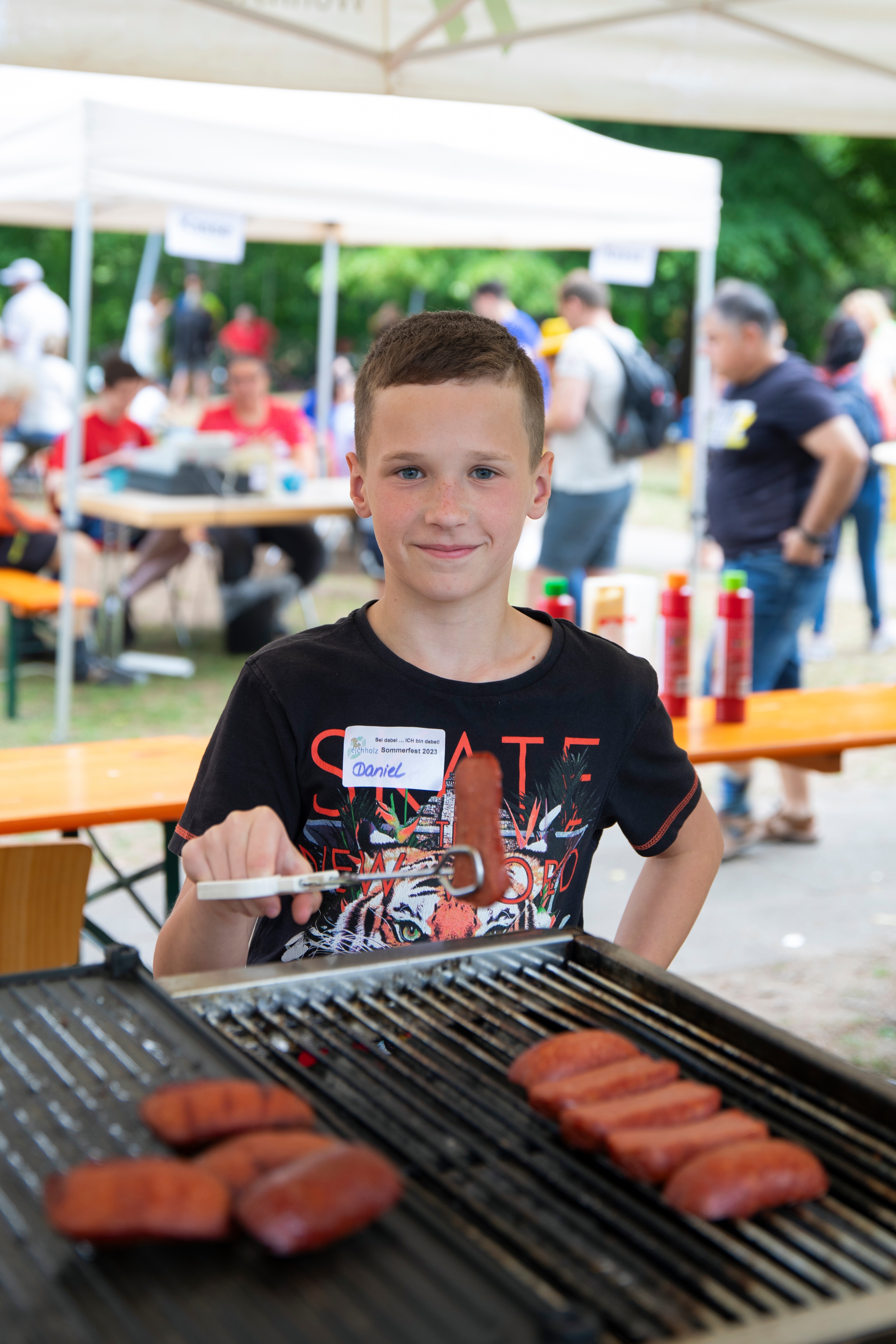Zu indischen Bollywoodklängen wurde getanzt, das neue Eingangsschild ins Eichholz enthüllt und weitere spontane Tanz- und Singeinlagen gegeben. Die Lose waren schnell verkauft, der Eiswagen ebenso belagert wie der Pommes- und Grillstand. Dazu gab es Salat und Kuchen sowie Getränke.