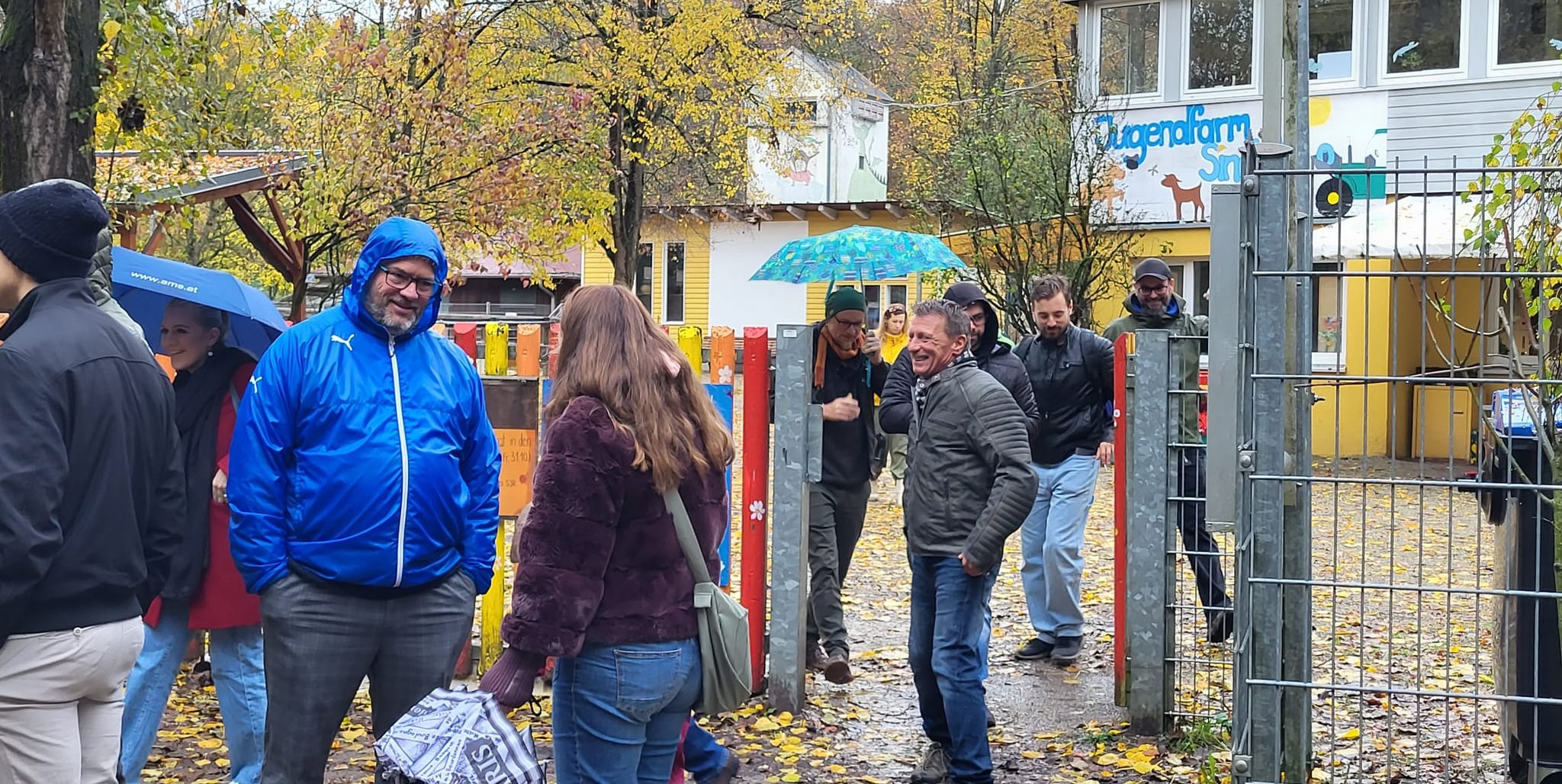 Ein besonderes Highlight war anschließend der Besuch der Jugendfarm Sindolino. Christian Strauß und Nicole Braun führten über das Gelände und erklärten das pädagogische Konzept der Farm, die Kindern und Jugendlichen Raum zum Forschen, Entdecken und eigenständigen Gestalten bietet. Für viele der österreichischen Gäste war dieses Konzept neu – Jugendfarmen in dieser Form gibt es in Österreich bislang nicht. Die Esel auf der Farm sorgten für einen weiteren sympathischen Höhepunkt: Sie ließen sich ausgiebig streicheln und sorgten für strahlende Gesichter bei den Besuchern.