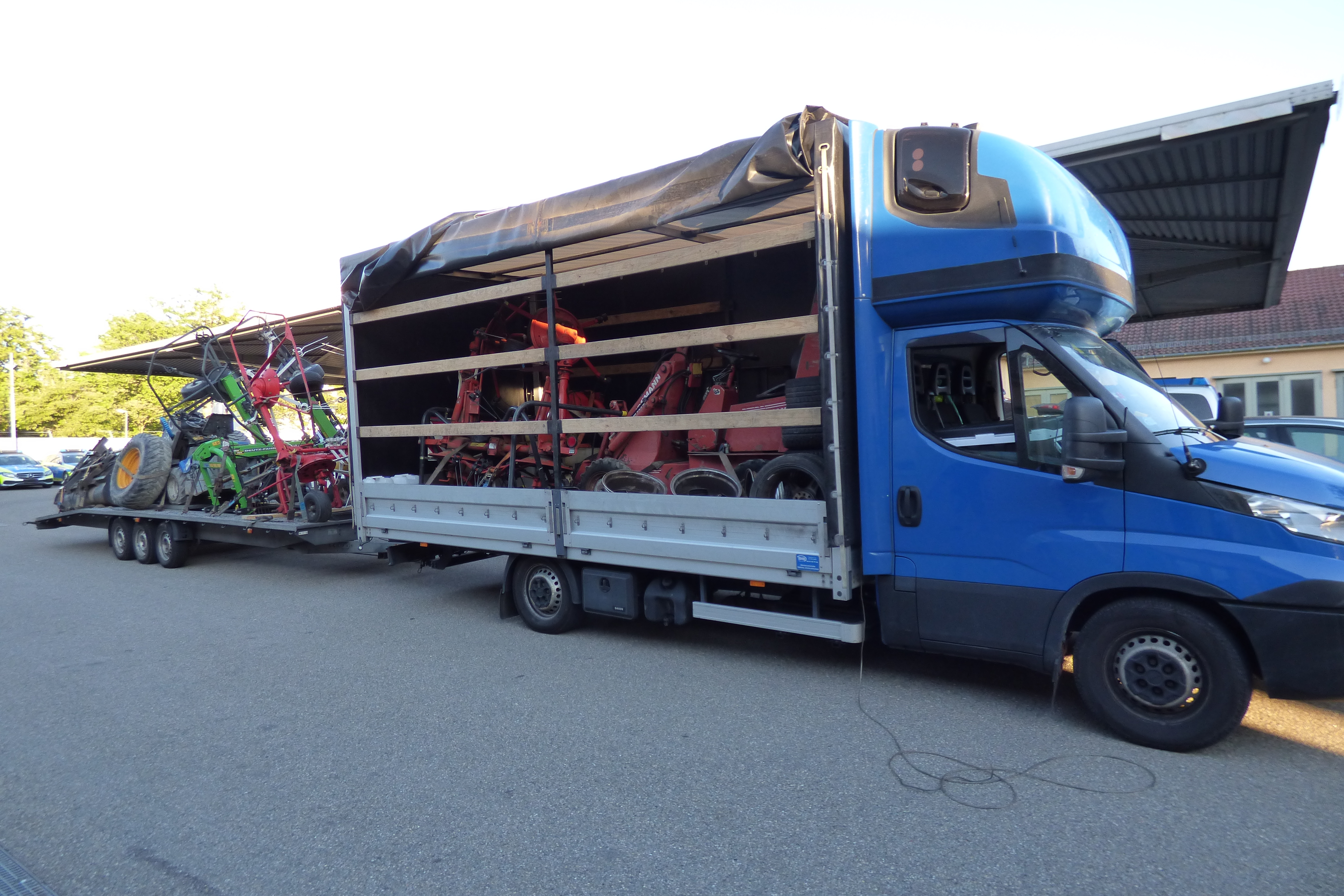 Beamte der Verkehrspolizeiinspektion Ludwigsburg zogen am Dienstagabend ein Lkw-Anhänger-Gespann aus dem Verkehr, das zahlreiche Mängel aufwies und überladen war. Gegen 19 Uhr fiel einer Streifenwagenbesatzung auf der Bundesautobahn A8 zwischen dem Autobahnkreuz Stuttgart und der Anschlussstelle Leonberg-Ost das augenscheinlich überladene Gespann auf. Bei der anschließenden Kontrolle stellten die Beamten fest, dass weder die Ladung des Lasters noch die des Anhängers ausreichend gesichert worden war. Bei der Fracht handelte es sich größtenteils um landwirtschaftlichen Nutzgeräten. Im Laderaum des Lkw befanden sich außerdem diverse Fahrzeugteile, die keinerlei Sicherung aufwiesen. Vom 45 Jahre alten Fahrer benutzte Zurrgurte waren rissig und hätten nicht mehr eingesetzt werden dürfen. Im weiteren Verlauf wurde die Kontrolle auf dem Gelände der Verkehrspolizeiinspektion in Stuttgart-Vaihingen fortgesetzt, wo Laster und Anhänger gewogen wurden und ein Bremstest durchgeführt wurde. Der 3,5-Tonner war mit knapp 1500 Kilogramm um 42 Prozent überladen. Der Anhänger um weitere 15 Prozent. Der Bremstest verlief dahingehend auffällig, dass die Auflaufbremse und die Feststellbremse des Anhängers keinerlei Wirkung zeigten. Außerdem löste sich währenddessen ein geladener Traktorreifen und fiel auf den Asphalt. Auch die Bremsen des Lkw sind nicht mängelfrei. Insgesamt befindet sich das Gespann in einem maroden Zustand, sodass die Beamten die Weiterfahrt untersagten. Eine Vorführung bei einer technischen Prüfgesellschaft soll am Mittwoch erfolgten. Der 45 Jahre alte Fahrer wird eine Sicherheitsleistung im oberen dreistelligen Euro-Bereich hinterlegen müssen. (Bild: Polizei)