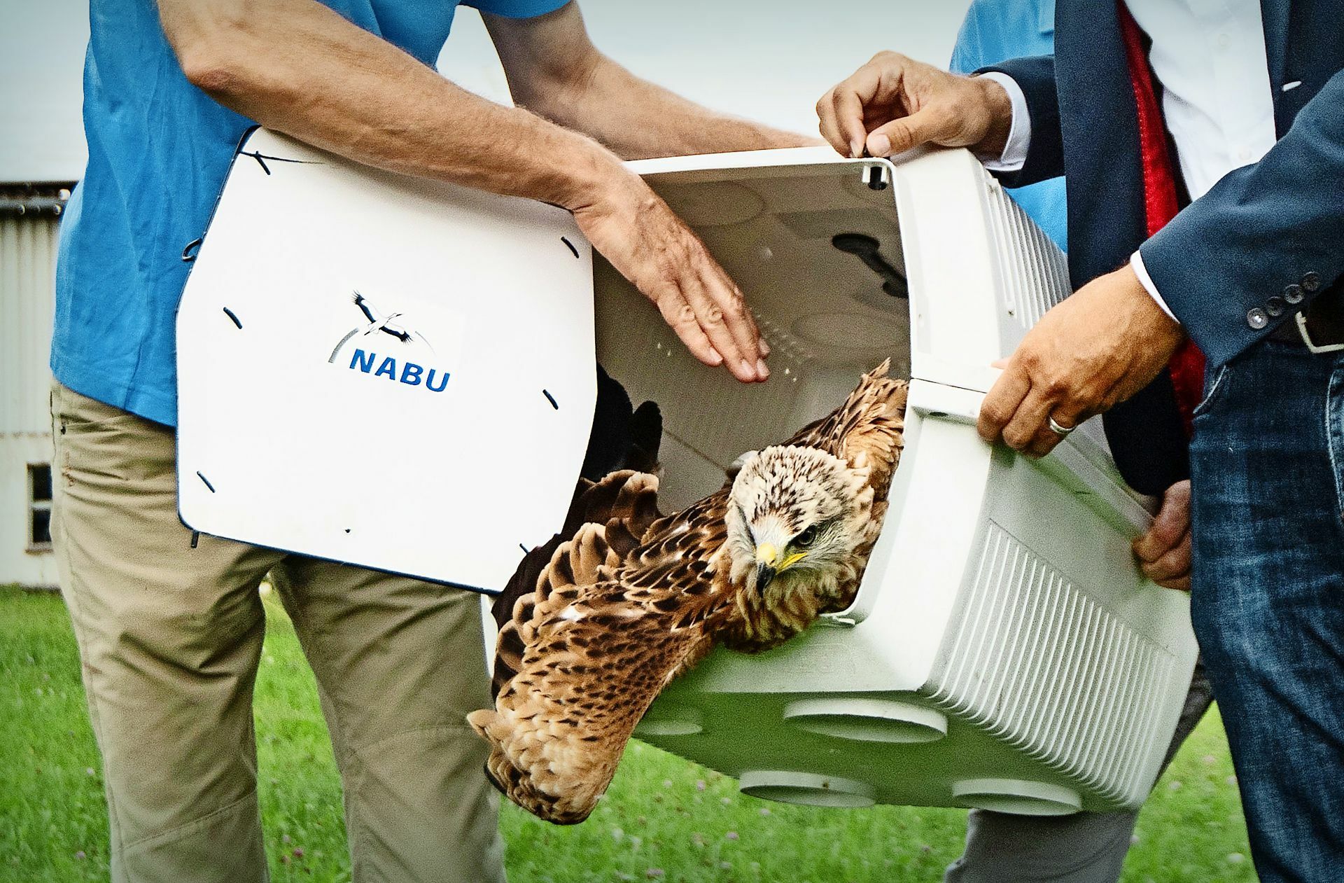 Mössingen - Ein eleganter Start sieht anders aus: Zuerst will der junge Rotmilan gar nicht aus der Transportbox, dann plumpst er ungeschickt auf die Wiese, und zuletzt hält er sich nur mit Mühe in der ...