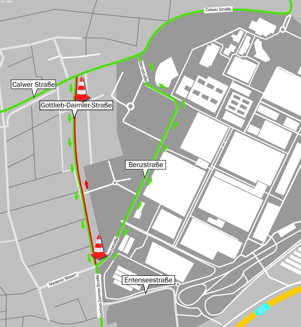 Westlich der Gottlieb-Daimler-Straße entsteht seit Anfang Januar ein neues Daimler-Parkhaus auf dem Niederen Wasen. Ab dem 3. Juni gibt es Bauarbeiten entlang der Gottlieb-Daimler-Straße zwischen der Calwer Straße (L1183) und der Entenseestraße. Dies erfordert eine Sperrung der Fahrtrichtung Nord (Richtung Maichingen) von der Kreuzung Gottlieb-Daimler-Straße / Benzstraße bis zur Kreuzung Calwer Straße während der gesamten Baumaßnahme. Die Umleitungsstrecke wird über die Benzstraße eingerichtet. ...