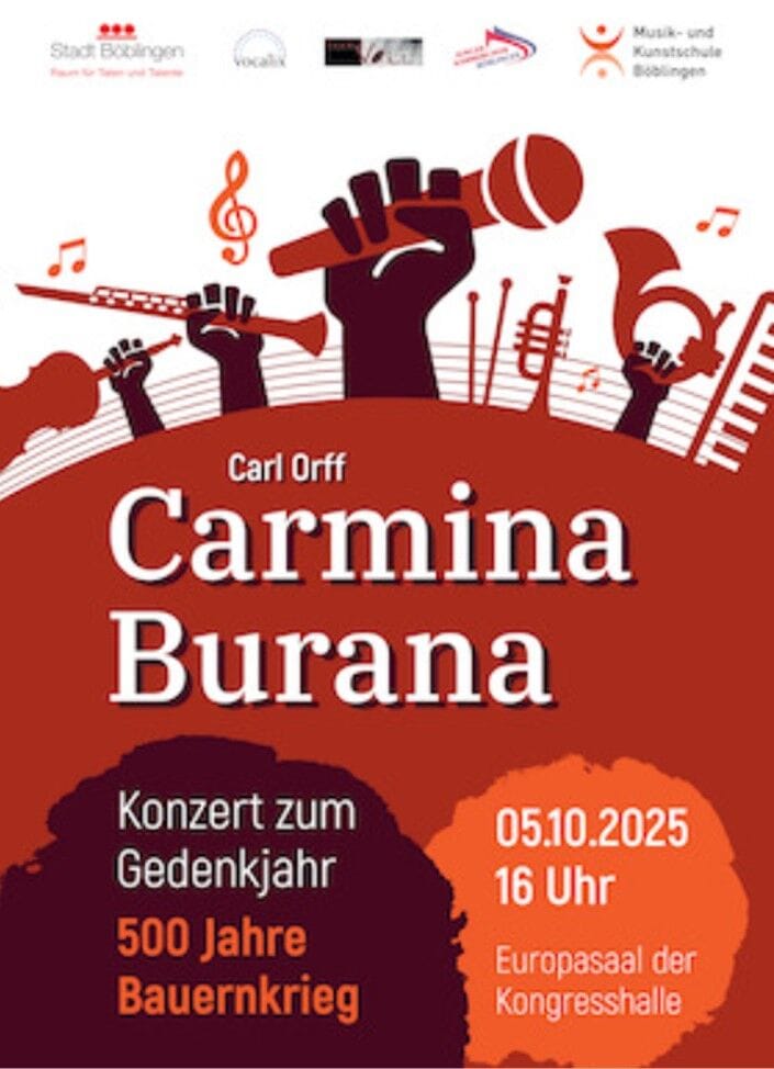 Der Bauernkrieg um 1525 prägte auf Generationen das kollektive Gedächtnis im deutschsprachigen Raum. Im Verlauf der Auseinandersetzungen stellten die Bauern erstmals Forderungen auf, die als frühe Formulierung von Menschenrechten gelten. Am 12. Mai 1525 unterlagen die württembergischen Bauern in der Schlacht bei Böblingen dem gegnerischen Heer. Zum Gedenken an diese Ereignisse wird am 5. Oktober die Carmina Burana aufgeführt. Unser gemischter Chor TAKTVOLL wirkt zusammen mit dem Liederkranz Böblingender und dem Jungen Kammerchor der Musikschule Böblingen mit. Tickets zu 25 € (15 € ermäßigt) sind über www.Reservix.de erhältlich; Kinder unter 12 Jahren erhalten freien Eintritt.