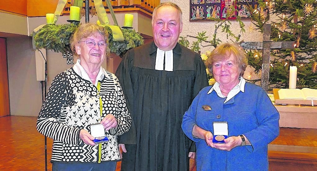 Die Brenz-Medaille ist die höchste Auszeichnung der evangelischen Landeskirche. Am Sonntag überreichte Pfarrer Jens Junginger im Namen des Bischofs die Medaillen und Urkunden an Ingrid Balzer und Heidi Beduhn.