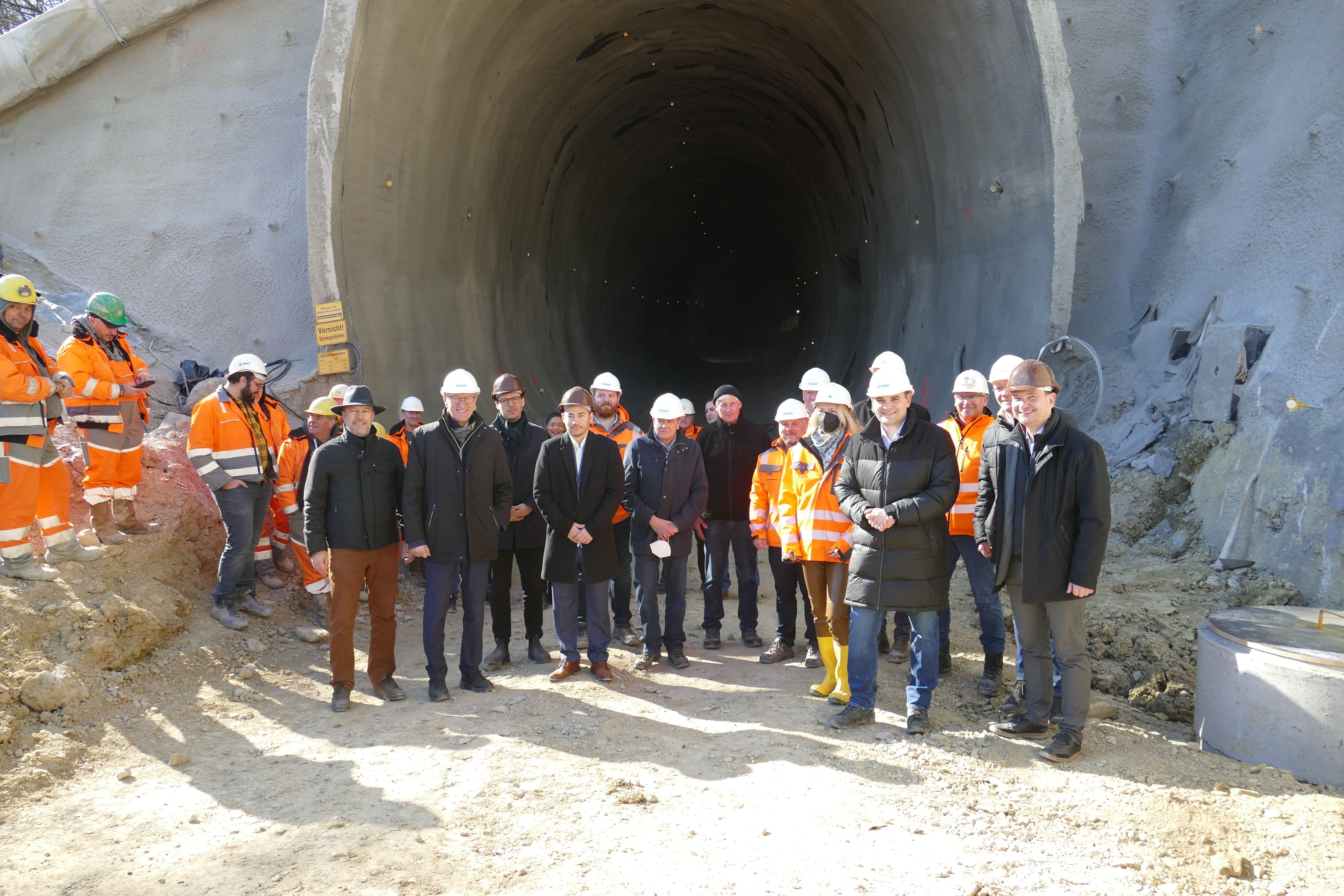Kreis Calw/Kreis Böblingen. Der Neubau des Tunnels zwischen Ostelsheim und Weil der Stadt („Iris-Tunnel“), der die Fahrzeit der Hermann-Hesse-Bahn maßgeblich reduziert, schreitet voran. Der Tunnel ist die größte Einzelmaßnahme im Rahmen des Projektes und Kernstück der reaktivierten Strecke. Im Juli wurde der Iris-Tunnel in Ostelsheim im Beisein von Minister Hermann feierlich angeschlagen. Nach knapp sieben Monaten bergmännischem Vortrieb ist es nun soweit: Der Durchschlag des 498 Meter langen Neubautunnels konnte am Dienstag, 8. März feierlich begangen werden.