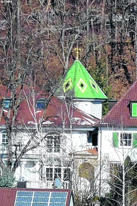 Villa und Mehrfamilienhaus sind von hohen Mauern und Zäunen umgeben. Das Türmchen mit dem grünen Ziegeldach (rechts) ist weithin sichtbar. Bilder: Reichert