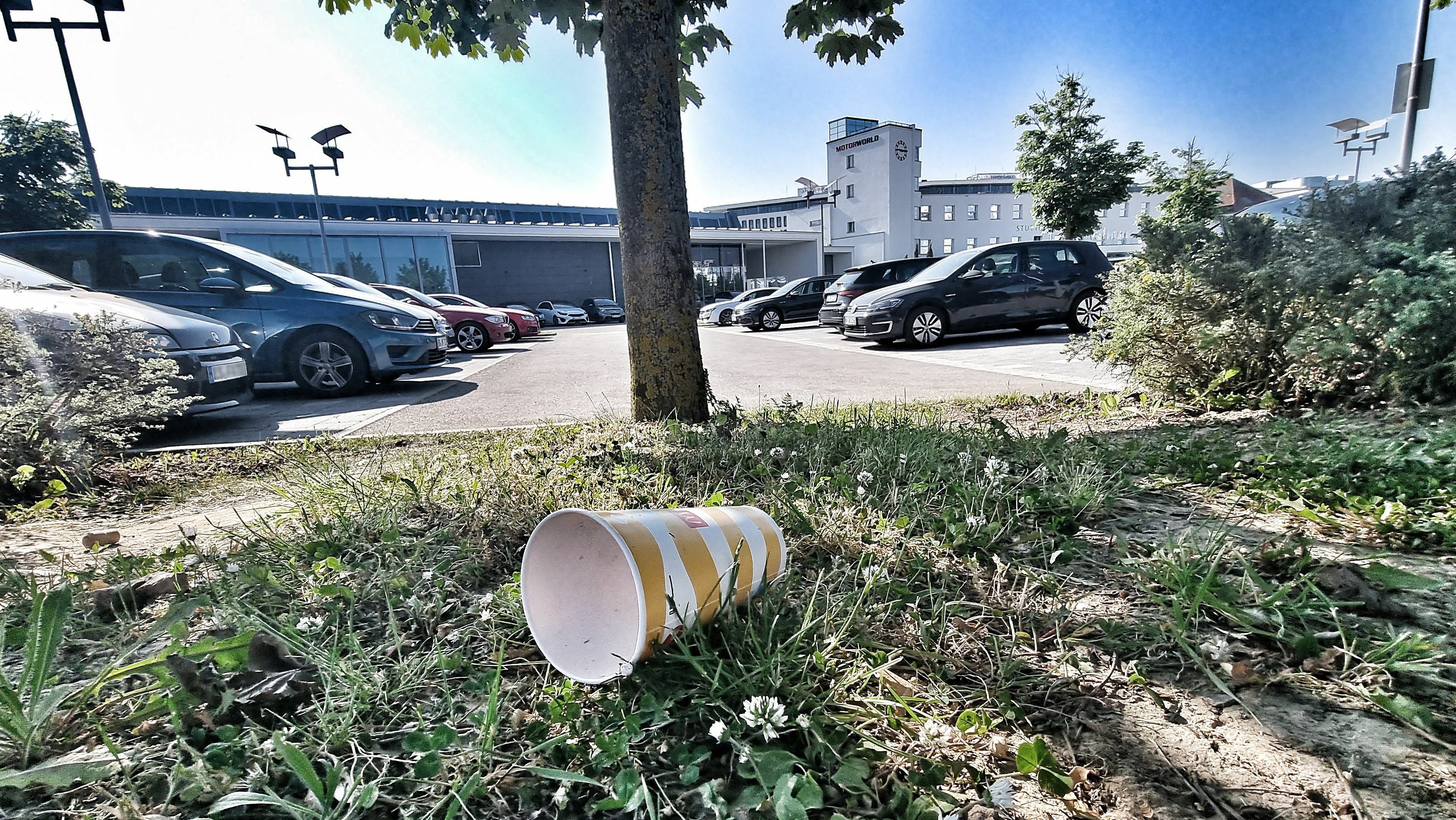 Ein Becher liegt auf einem Grünstreifen in vor der Motorworld auf dem Flugfeld. So wie viele andere Kommunen haben auch die Städte Böblingen und Sindelfingen ein massives Problem mit Wildem Müll – auch achtlos weggeworfene Einwegverpackungen gehören dazu. Gegen die Vermüllung geht die Stadt Tübingen jetzt mit einer Verpackungssteuer vor. Bild: Hamann
