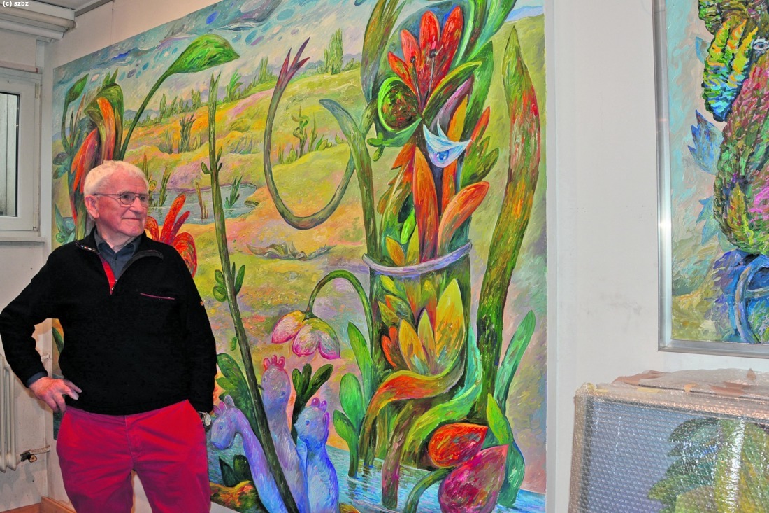 Entstanden 2016, als der Altdorfer Künstler 85 Jahre alt wurde. Jetzt hängt es wie ein großer Bruder in seiner 20. Atelierausstellung. Wo gerade, es ist früher Sonntag Nachmittag, reger Betrieb herrscht. ...