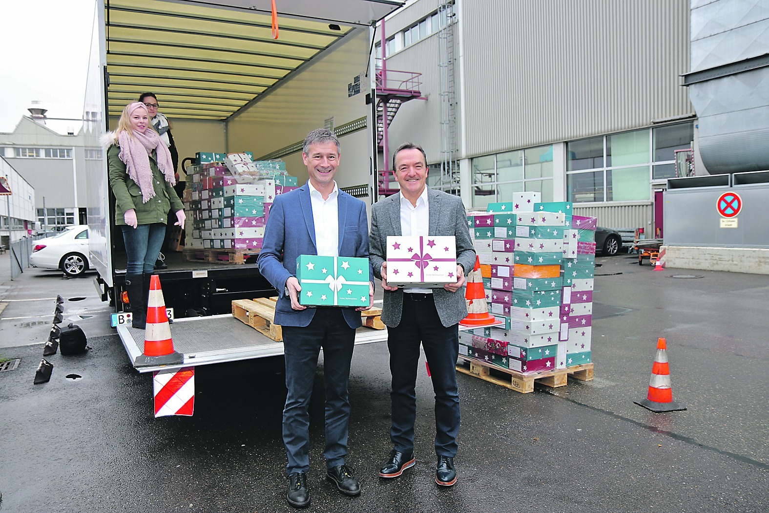 Auch Werkleiter Michael Bauer (links) und der Betriebsratsvorsitzende Ergun Lümali helfen bei der Geschenkaktion mit. Bild: z