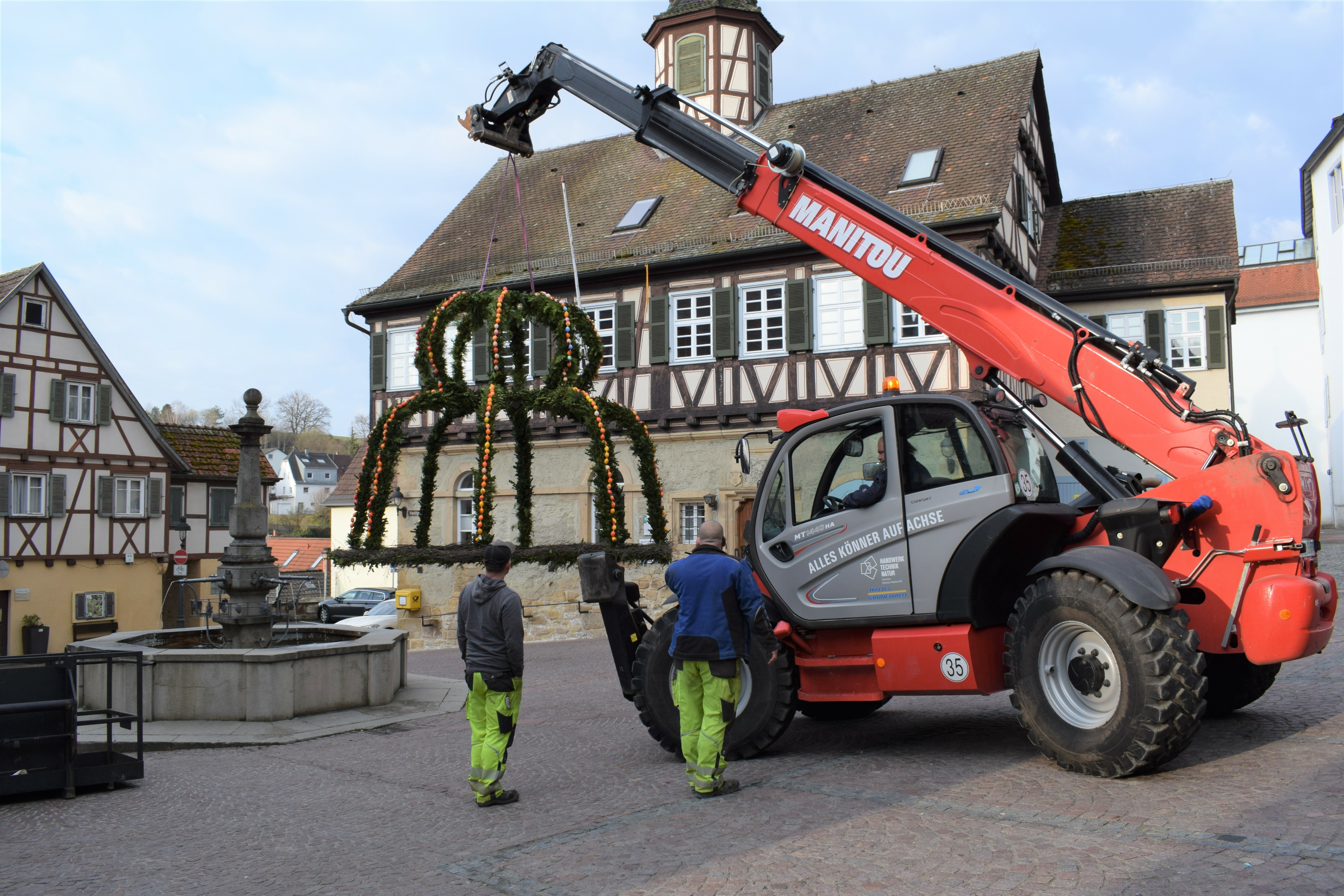 Auch die bemalten echten Ostereier der Kindergärten wurden vergangene Woche vom Dachboden geholt und mit Holzperlen auf eine Schnur gefädelt. Zusammen mit Karin Kolb von der Grabpflege Rebmann mit Team sowie mit Unterstützung des Obst- und Gartenbauvereins Waldenbuch wurde die Osterkrone Ende März nun mit viel Liebe zum Detail unter Wahrung der aktuellen Corona-Verordnungen dekoriert. Der Zweckverband Dettenhausen-Waldenbuch übernahm den Aufbau. Dabei kam schweres Gefährt zum Einsatz, denn die Krone musste einmal über den Marktbrunnen angehoben und Zentimetergenau platziert werden. Jetzt sind alle Waldenbucher Kinder und ihre Familien aufgerufen, selbst kreativ zu werden und weitere Eier mit Draht an der Krone zu befestigen. Auch wetterfeste gebastelte Osterhasen sind willkommen. Diese können gerne auf den Treppen zur Stadtkirche St. Veit zur Freude weiterer Besucher aufgestellt werden.Der Osterbrunnen soll bis Mitte April bewundert werden können.