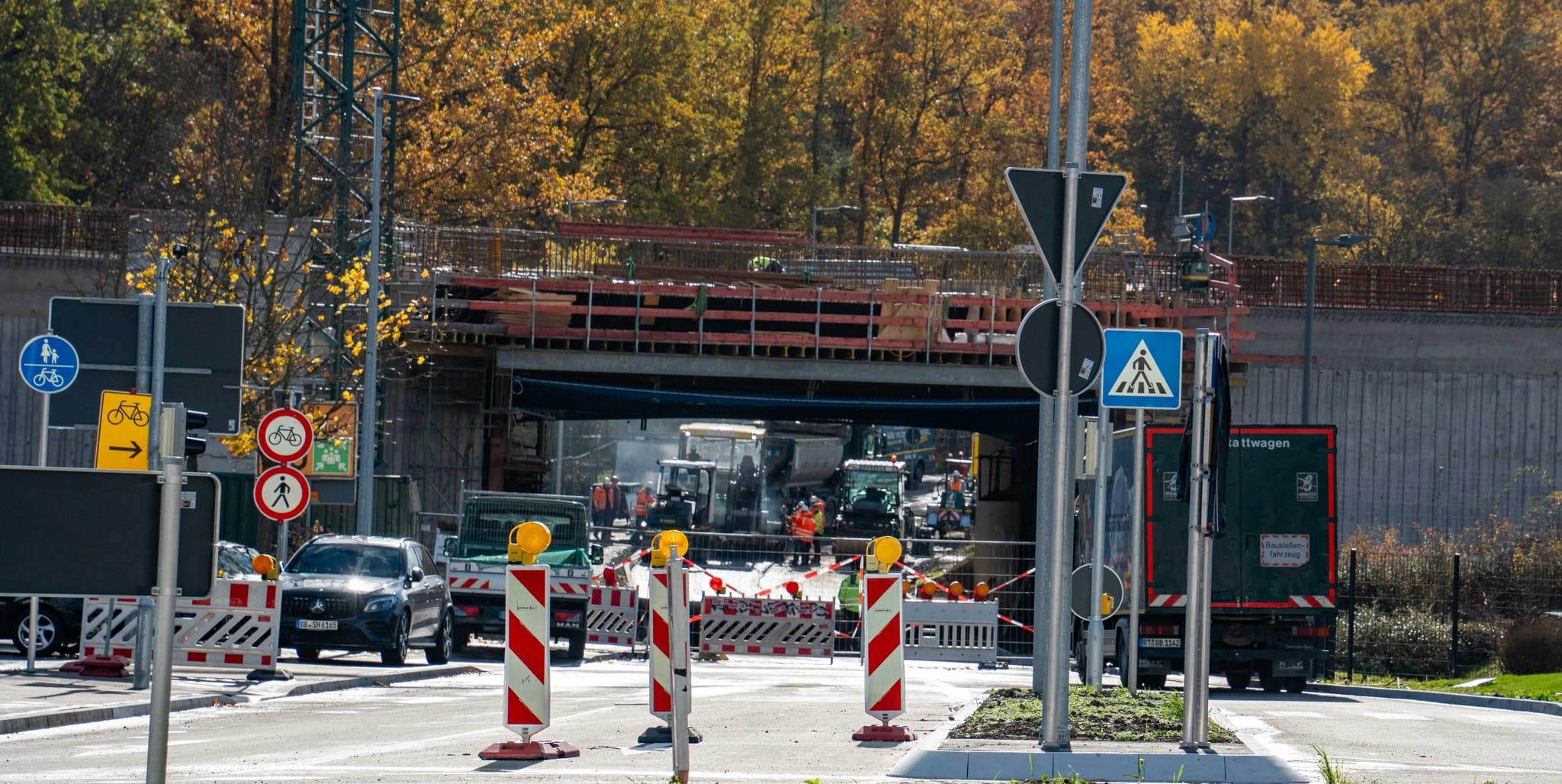 Seit Ende Mai war die Leibnizstraße in diesem Bereich dicht. Grund waren die Bauarbeiten am neuen Kreisverkehr beim Hofmeister, aber auch an der Unterführung selbst. Über der Leibnizstraße verläuft die A81. Die Autobahn wird von zwei auf drei Fahrstreifen pro Richtung erweitert, weshalb auch die Brücken angepasst werden.