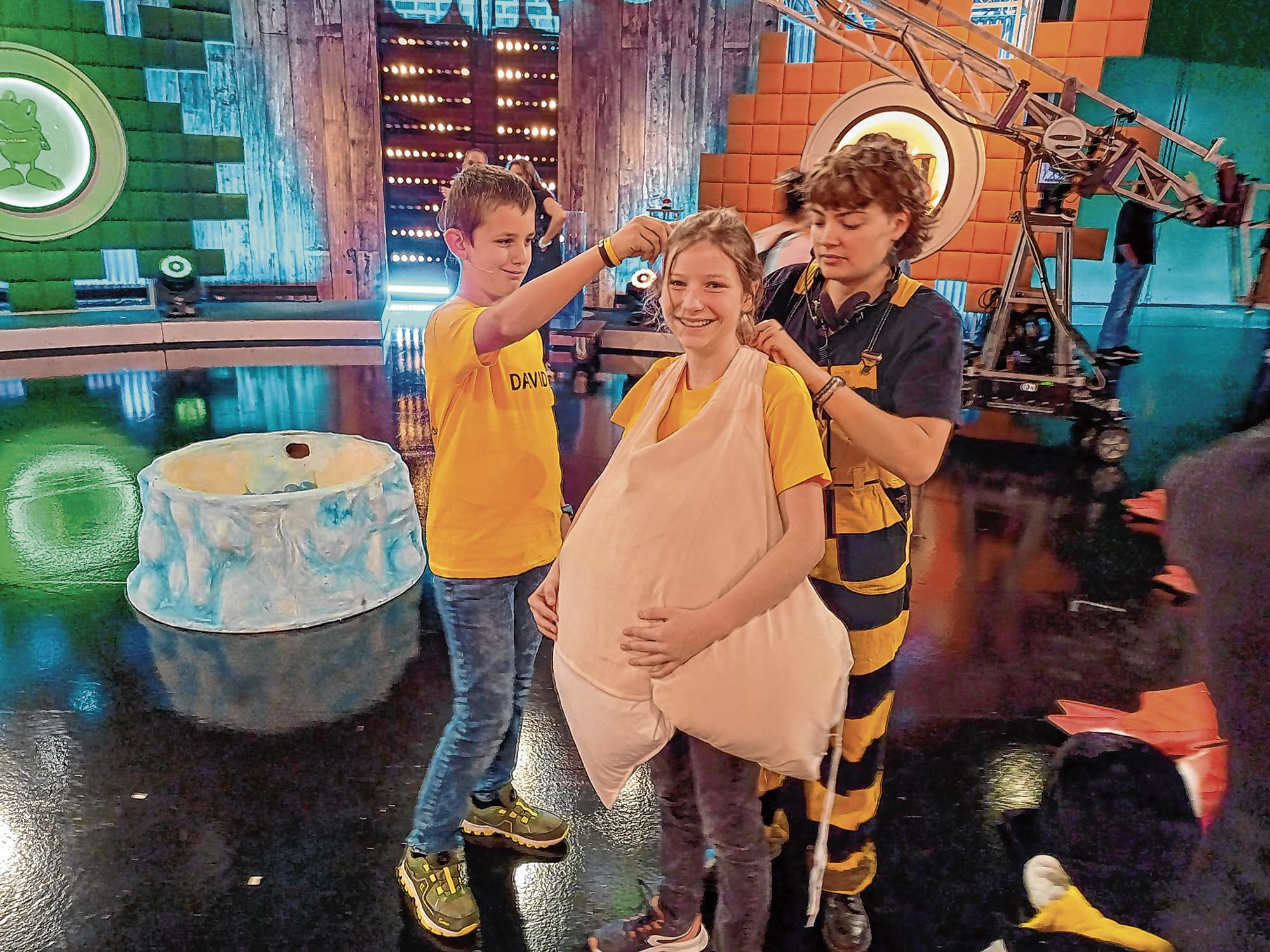 Holzgerlingen/Baden-Baden. Geduldig lässt Leonie im Fernsehstudio des SWR in Baden-Baden die Verwandlung über sich ergehen: Spielekinderbetreuerin Isabell Rupprecht bindet der Elfjährigen ein dickes Kissen um den Bauch, darüber kommen ein Fellanzug und ein Fellkopf, die Füße steckt Leonie in zwei Flossen. Fertig ist der Pinguin.