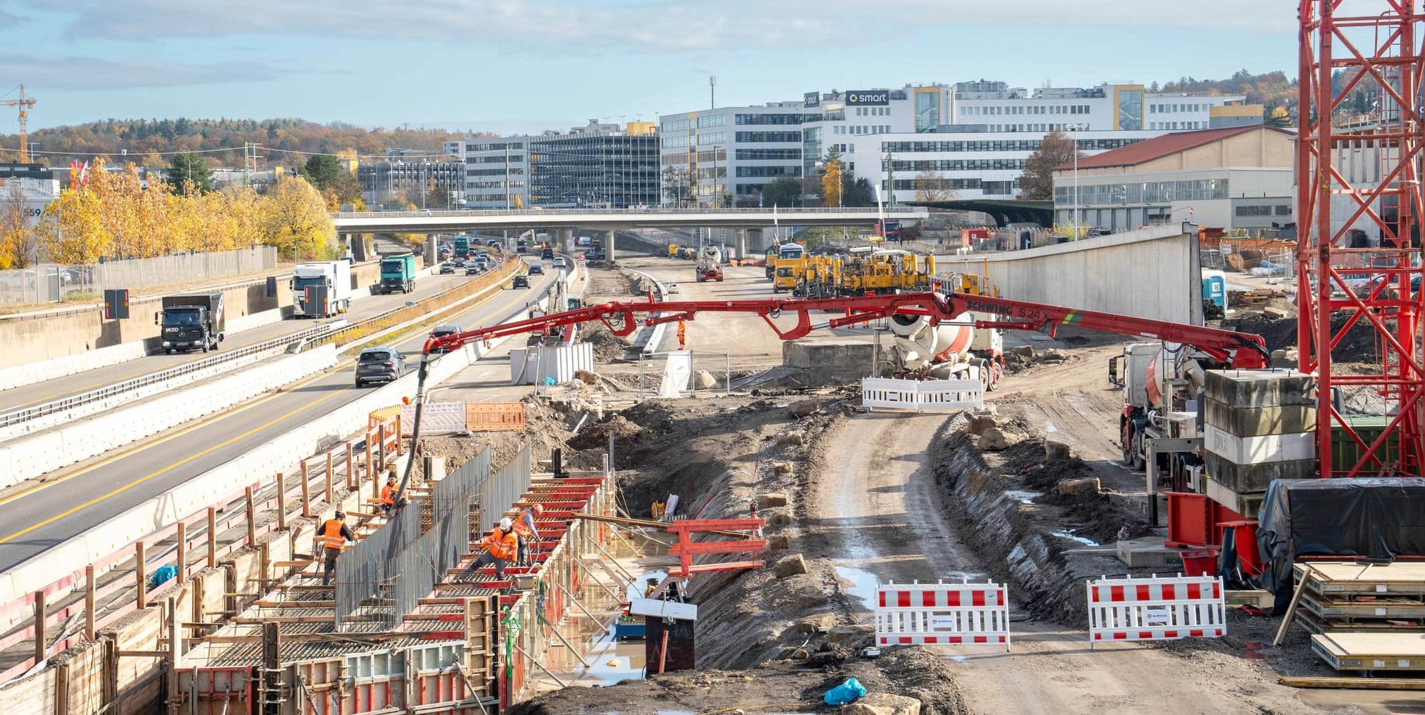 In der nächsten Bauphase in diesem Bereich wird die Nordseite (auf der Sindelfinger Seite) der neuen A81 fertiggestellt: Das umfasst den Abschnitt vom Tunnelportal bis zur Bahnbrücke und Wolfgang-Brumme-Allee. Das ist Voraussetzung, um die nördliche Tunnelröhre im Frühjahr 2027 für den Verkehr freigeben zu können. Die Autos brausen dann auf jeweils zwei Fahrstreifen durch diese Tunnelröhre, bis die Südröhre in Richtung Stuttgart voraussichtlich Ende 2027 fertig ist.