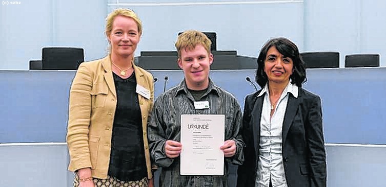 Die Landtagsabgeordnete Thekla Walker (links) und die Landtagspräsidentin Muhterem Aras (rechts/beide Grüne) ehren Dominik Müller von der Böblinger Käthe-Kollwitz-Schule. Er gehört zu den Gewinnern, die ...