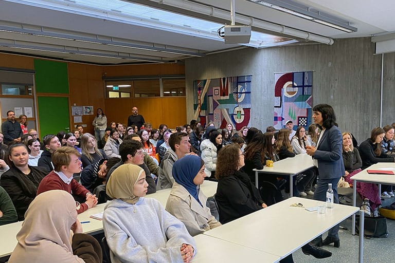 Bei ihrem Besuch an der Mildred-Scheel-Schule klärte Muhterem Aras nicht nur über die Aufgaben ihres Amtes auf, sondern berichtete auch von ihrem Arbeitsalltag und den Konsequenzen, welche ein so hohes Amt mit sich bringt. So sei in den letzten Legislaturperioden der Umgangston im Parlament rauer geworden, was schließlich auch Herausforderungen für die Sitzungsleitung mit sich bringe und teils zu heftigen Auseinandersetzungen im Parlament führe. Von Hassmails und Bedrohungen bleibe auch sie nicht verschont, was Folgen auch für das Privatleben habe. Wie sehr unsere freiheitlich-demokratische Grundordnung zunehmend unter Druck gerate, lasse sich daran ebenso ablesen wie an so manchen Anfragen und zur Debatte gestellten Themen. Immer wieder betonte Frau Aras, in welch wunderbarem Land wir alle in Freiheit leben dürfen und welch großer Schatz unsere Demokratie sei, die es zu schätzen und zu schützen gelte.