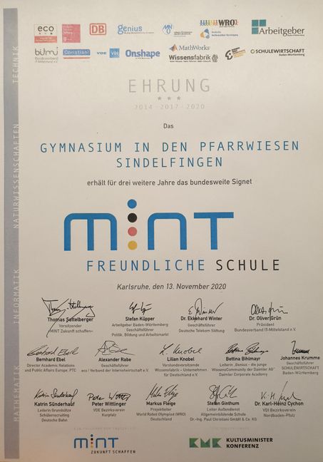 Aller gute Dinge sind drei: Das Sindelfinger Gymnasium in den Pfarrwiesen hat zum zum dritten Mal (2014, 2017, 2020) das von der Kultusministerkonferenz ausgelobte Siegel „MINT-freundliche Schule“ erhalten.