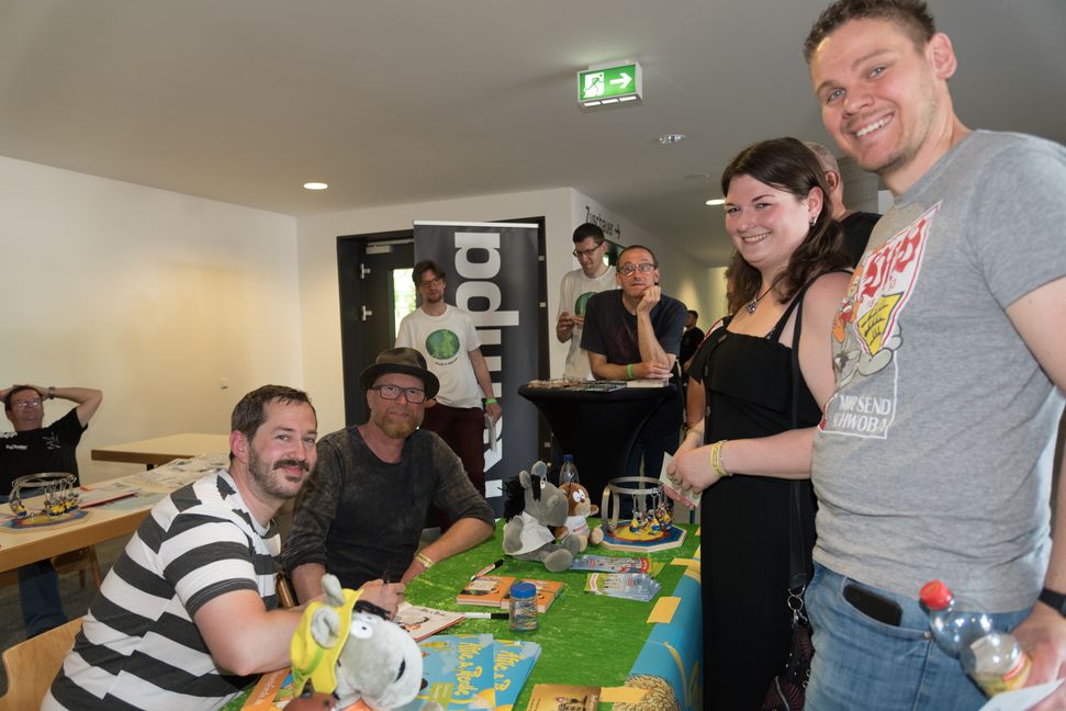 Mit den Worten „Ha schee isch, aber für mi wär’s nix bei der Affehitz‘“, begrüßte Heiko Volz, die Stimme des schwäbischen Kultmaskottchens Äffle die Fans und Sportler bei den Deutschen Meisterschaften der Veteranen im Ringen. Grund seines Besuchs gemeinsam mit dem Zeichner Alexander Linke war das Treffen des Äffle- und Pferdle-Clubs. Seit über 10 Jahren sind Äffle und Pferdle die Maskottchen der Ringer des TSV Ehningen und es war klar, dass auch ein Clubtreffen mit zum Rahmenprogramm gehören muss. Andreas Süßer, Clubmitglied und Ringer, der damals die Idee hatte, dass die beiden Sympathieträger die Maskottchen werden sollen. Ganz neu zieren die beiden Figuren jetzt auch die Matten der Ringer. Bei der Autogrammstunde mit Heiko Volz und Alexander Linke ließen sich die Clubmitglieder Karten, Bücher und auch Kleidungsstücke mit Unterschriften und Zeichnungen verzieren. Auch so manchen Schuh ziert in Zukunft das Äffle. Mit Autogrammkarten gingen auch die Neumitglieder des Äffle und Pferdle-Clubs Tanja Dürr und Heiner Kremer aus Stuttgart nach Hause. Heiß diskutiert wurde natürlich auch das Thema einer Äffle- und Pferdle-Ampel. „Am Donnerstag ist es Thema im Petitionsausschuss des Landtags und wir hoffen, dass es bald eine enstprechende Ampel in Stuttgart geben wird“, sagte Klaus Winter vom Äffle- und Pferdle-Club. - an -/Bild: Nüßle