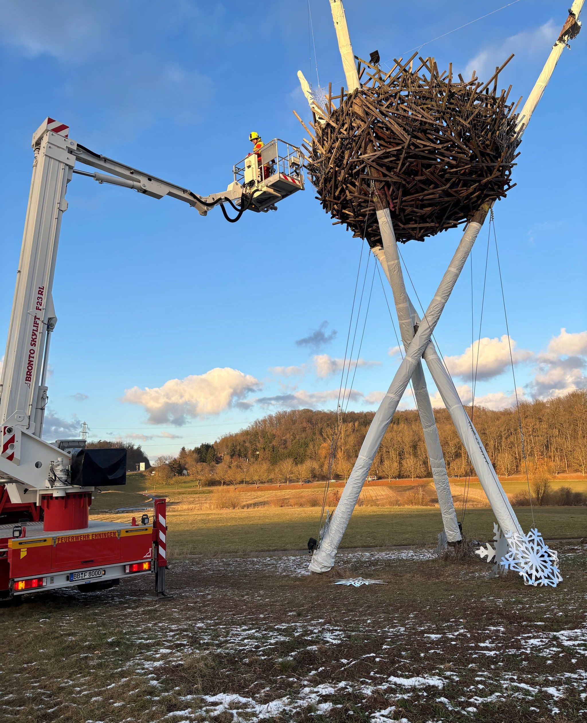 Ehningen. Zum Jahresende hatte die Feuerwehr Ehningen einen ungewöhnlichen Einsatz. Das Landratsamt Böblingen bat um Amtshilfe am Kunstwerk Vogelnest im Maurener Tal.