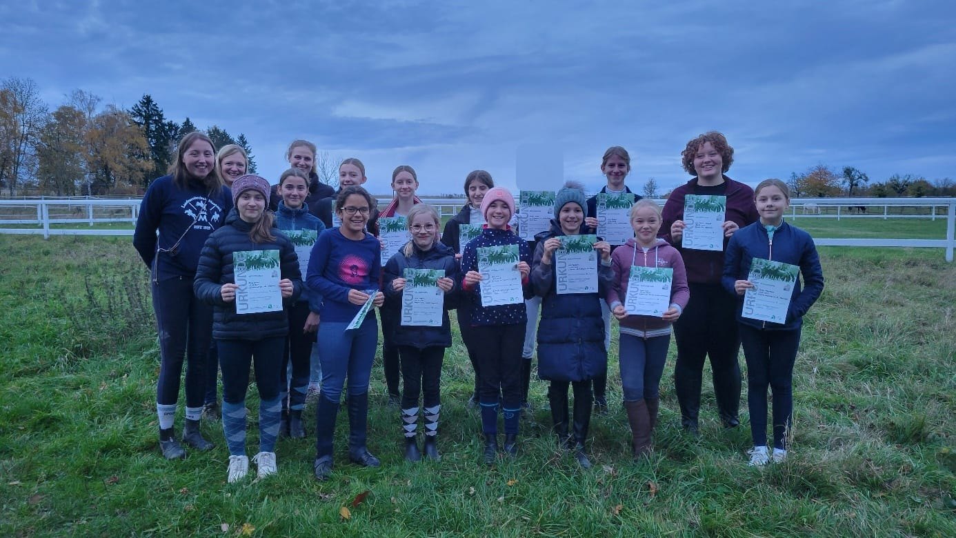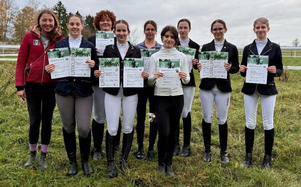 Zum Abschluss legten zehn Teilnehmerinnen den Pferdeführerschein Umgang ab. In Theorie, Bodenarbeit und im Führen des Pferdes – auch im Straßenverkehr – zeigten sie ihr Können. Dieses Abzeichen gilt als Grundlage für weiterführende Prüfungen wie das Reitabzeichen 5, das für Turnierreiter*innen Voraussetzung ist.