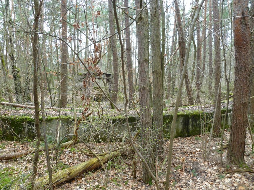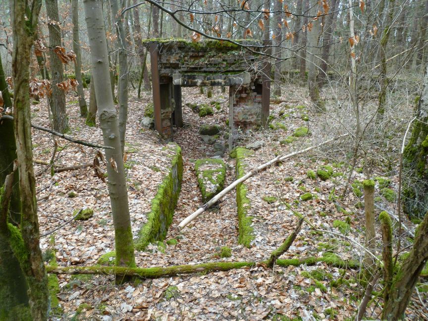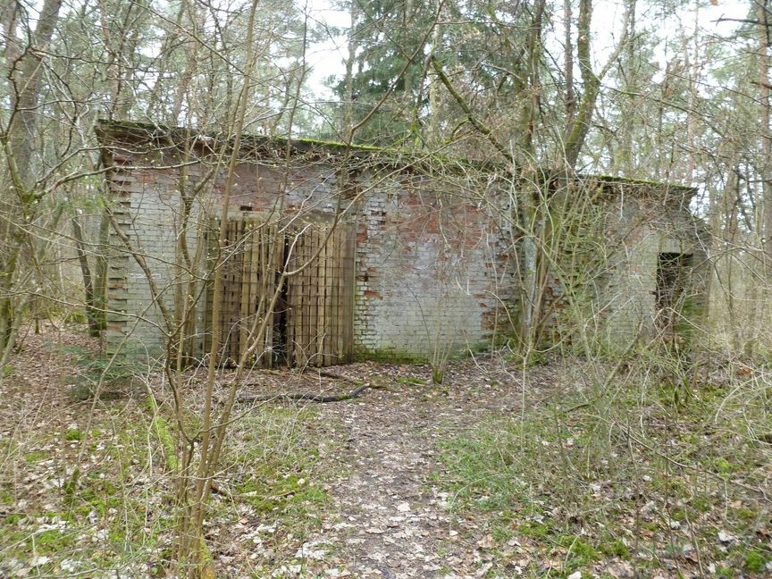 Mauerreste zweier Gebäude stehen zwischen Kiefern und Fichten. Ein Mauerkranz von etwa einem Meter Dicke und 30 Meter Durchmesser lassen die enormen Ausmaße der zum Kriegsende des zweiten Weltkrieges ...