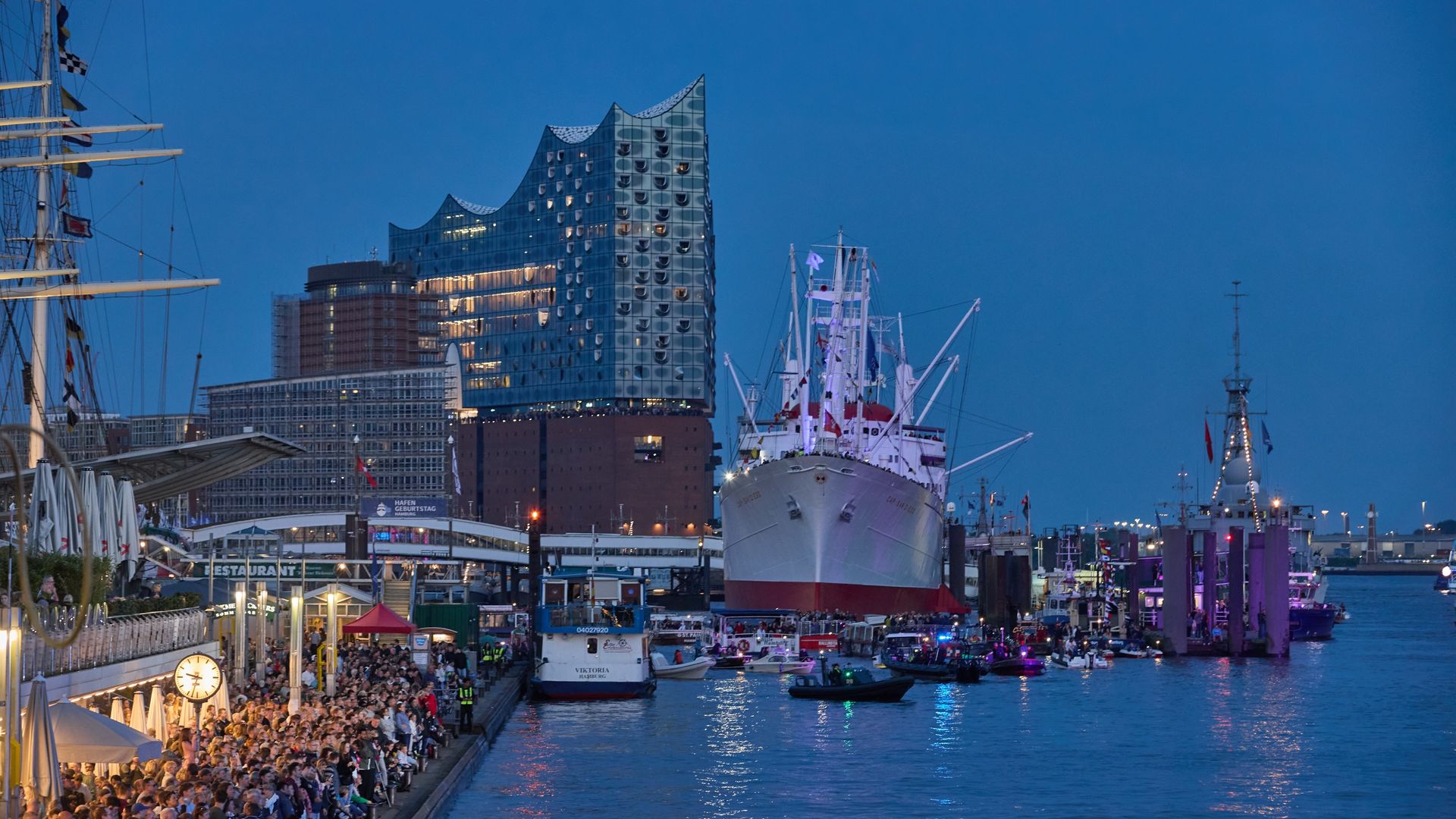 Hamburg feiert seinen 835. Hafengeburtstag. An den Landungsbrücken versammelten sich Tausende Besucher, um ein Feuerwerk und ein Konzert zu sehen. Auf einer schwimmenden Bühne trat die Band Scooter um Frontmann H.P. Baxxter auf.