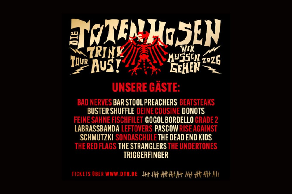 Die Toten Hosen haben für ihre große „Trink Aus! Wir Müssen Gehen“-Tour 2026 die Vorbands bekanntgegeben. Am 13. Juni 2026 auf dem Cannstatter Wasen in Stuttgart treten Feine Sahne Fischfilet, The Bar Stool Preachers und die Leftovers auf. Das Konzert in Stuttgart ist bereits ausverkauft.
