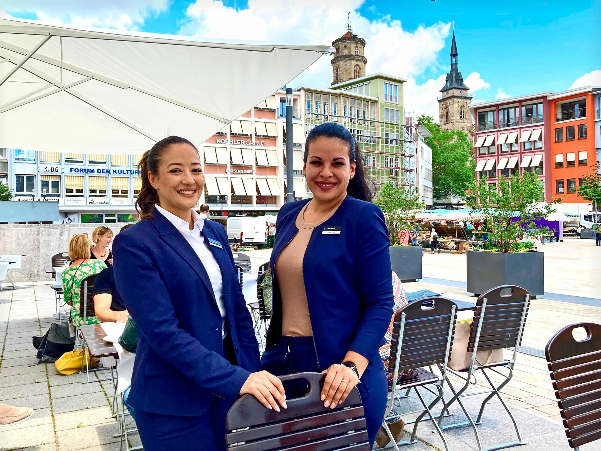 Neue Gastgeberinnen auf der Terrasse des Ratskellers am Marktplatz: Sarah Mohamaden (links) und Vanessa Bruna Foto: Matthias Ring