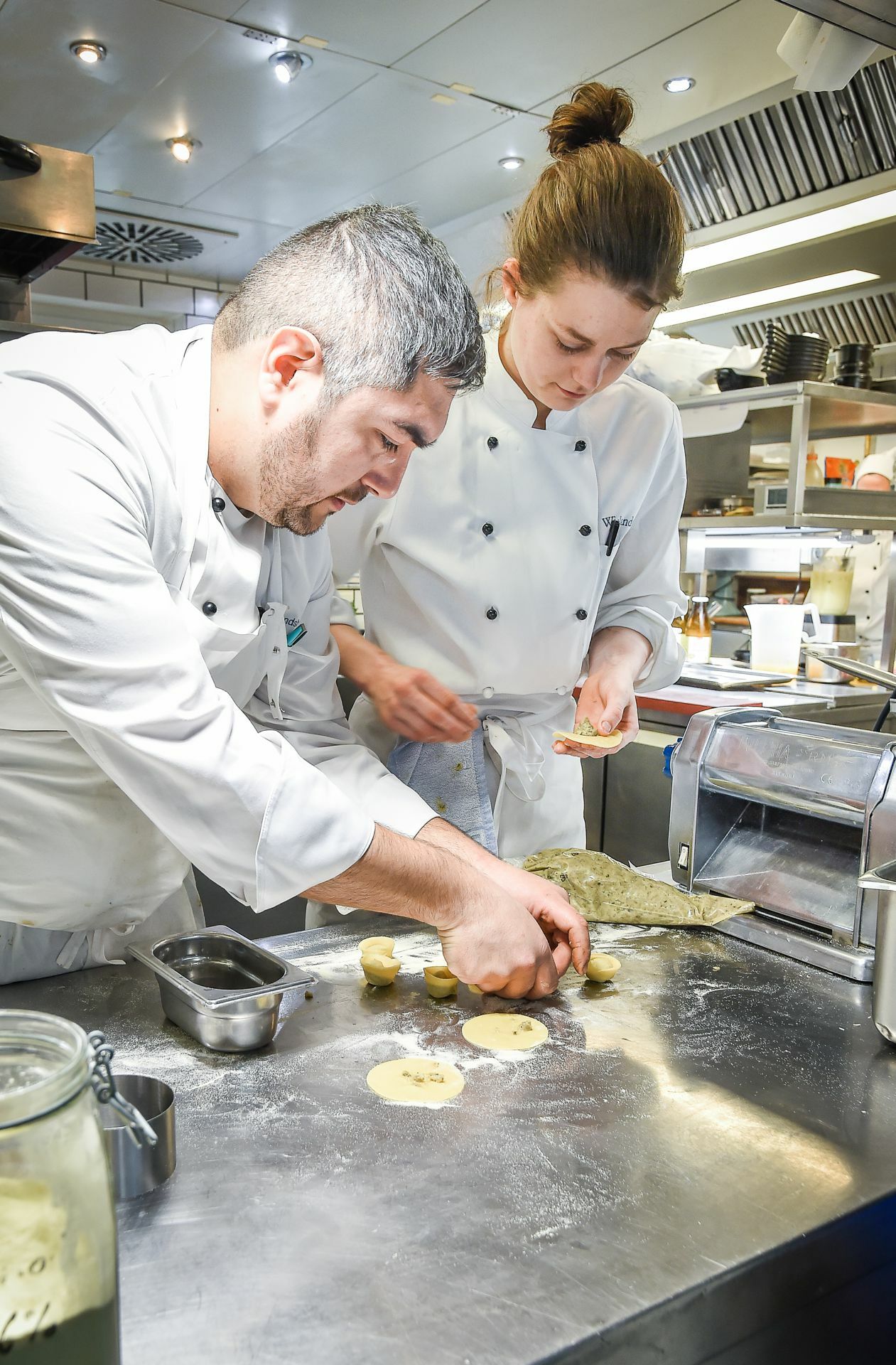 Entremetier Alessandro Puglisi zeigt Amanda die Kunst des Tortellifaltens.
