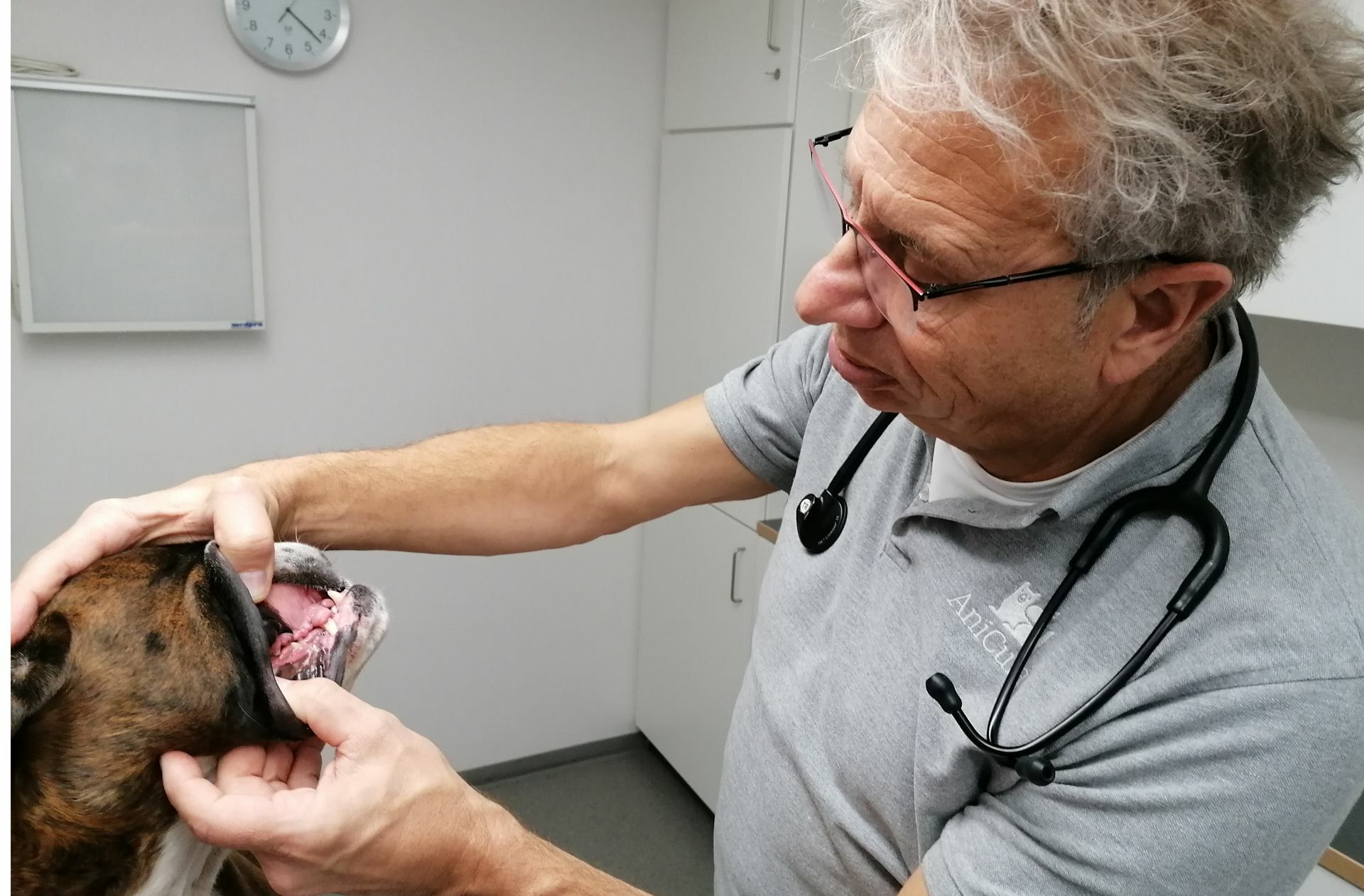 Thomas Rieker überzeugt sich vom Gebisszustand eines Boxers. Foto: /Gottschalk