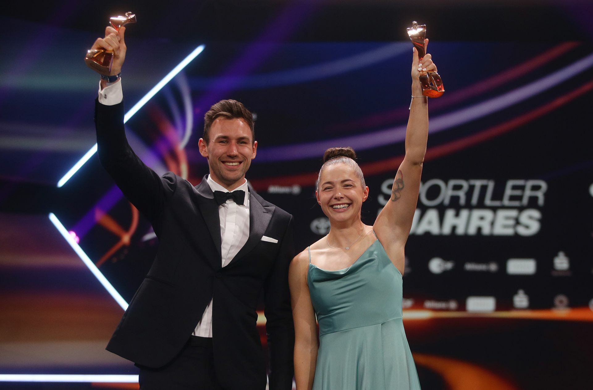 Niklas Kaul und Gina Lückenkemper feiern ihre Auszeichnungen.