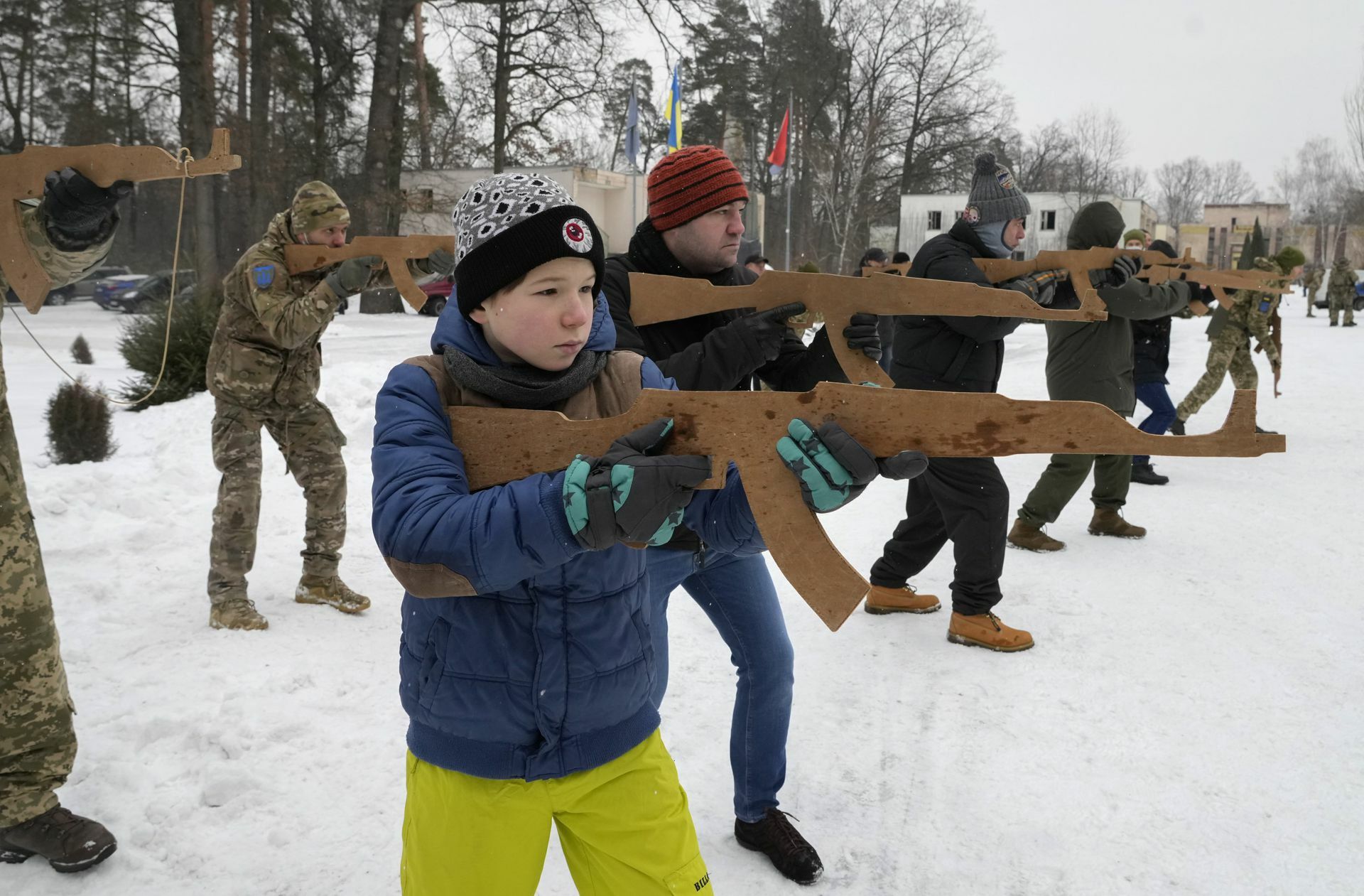 Aus Angst vor einer russischen Invasion haben sich Hunderte Zivilisten den ukrainischen Reservearmeen angeschlossen, darunter auch Kinder. Sie bereiten sich mit Holzgewehren auf ihren Einsatz vor.