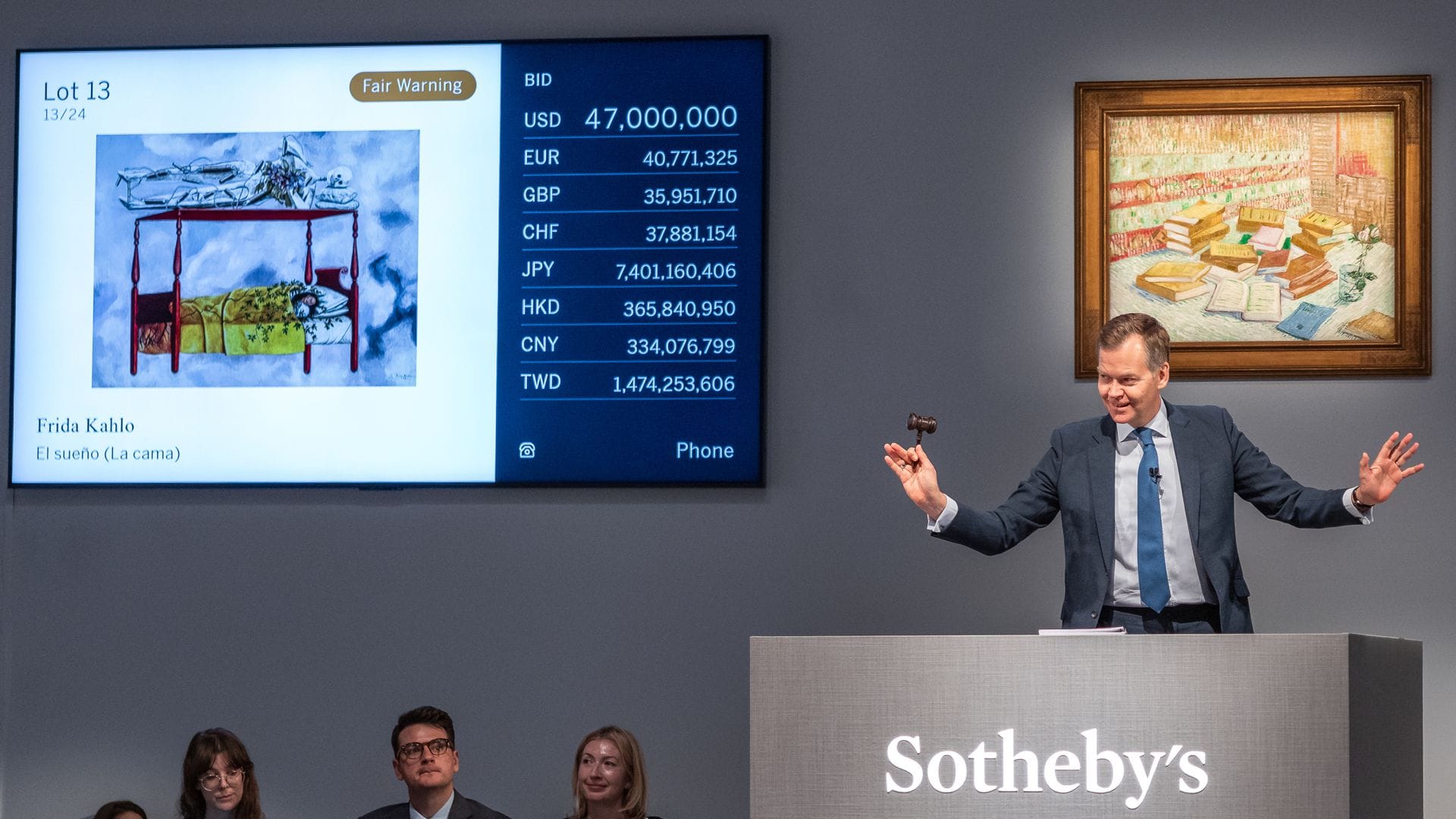 Ein Gemälde der mexikanischen Künstlerin Frida Kahlo (1907-1954) ist in New York für 54,7 Millionen US-Dollar (etwa 48 Millionen Euro) versteigert worden – und damit zum teuersten je bei einer Auktion verkauften Werk einer Frau geworden. Zwei Bieter hätten sich einen fünfminütigen Wettstreit um das 1940 gemalte Bild „El sueño (La cama)“ geliefert, das Kahlo im Bett liegend zeigt, teilte das Auktionshaus Sotheby’s mit. Wer schließlich den Zuschlag bekam, wurde zunächst nicht mitgeteilt.