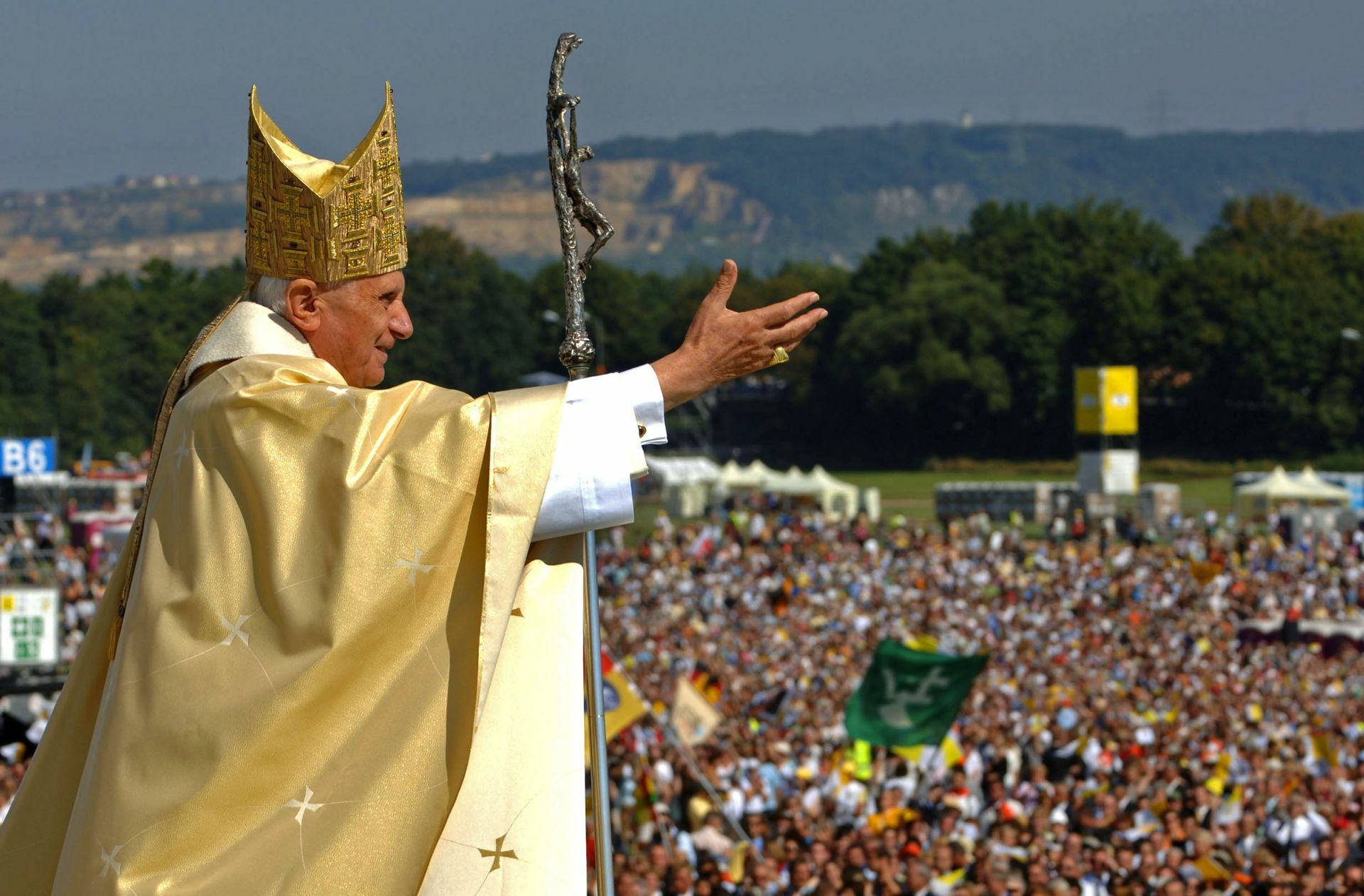Papst Benedikt XVI. winkt 2006 bei der heiligen Messe auf dem Islinger Feld in Regensburg den Gläubigen zu. Foto: dpa/Wolfgan Radtke