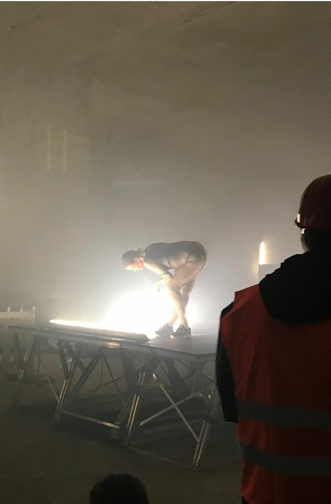 In einer Choreografie von Louis Stiens ist die Tänzerin Anne Jung dabei. Sie empfängt das Publikum am Tor zur Unterwelt, später konfrontiert sie in einem Solo den technoiden, von Beton dominierten Ort mit animalischer Beweglichkeit.