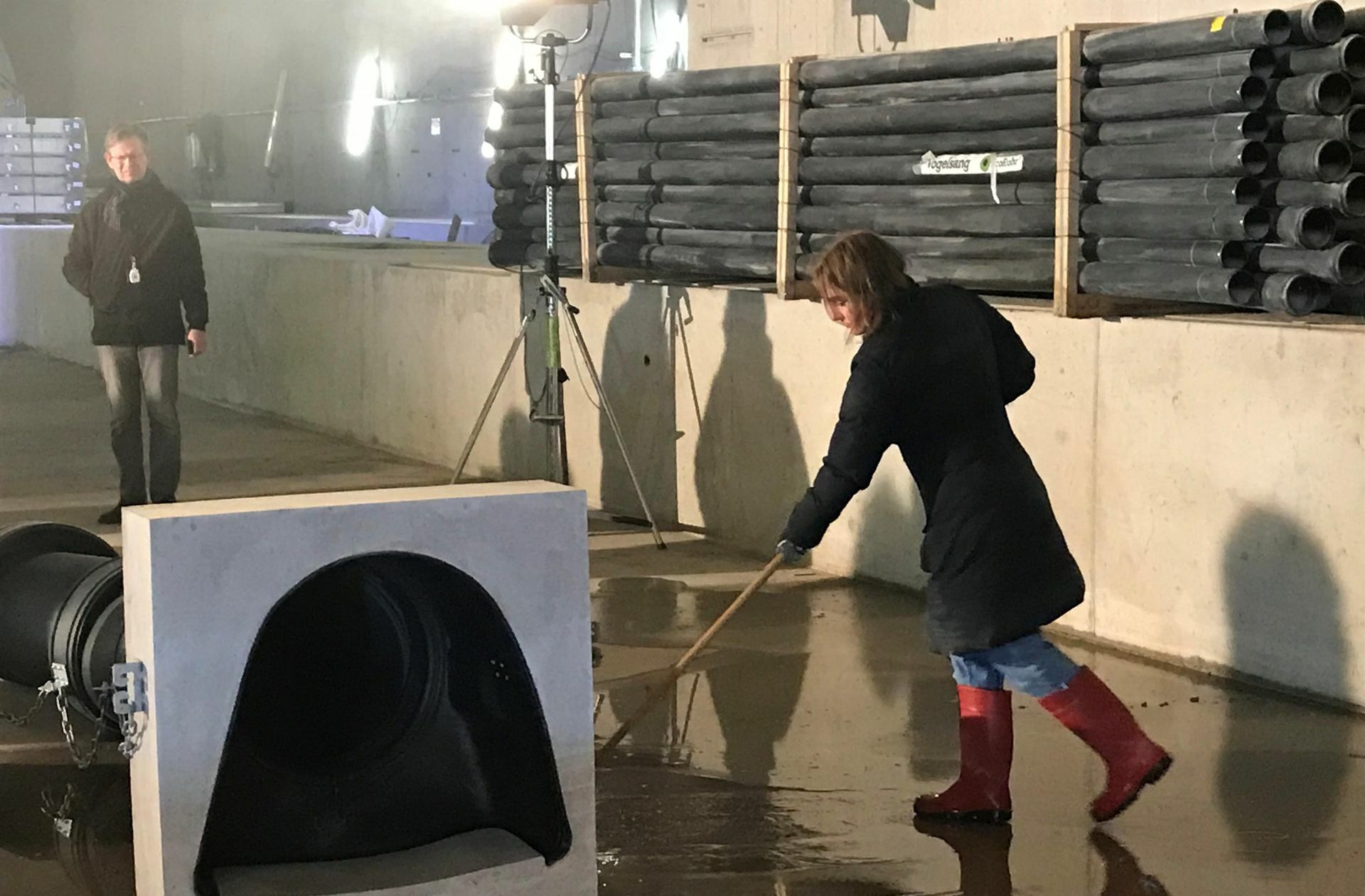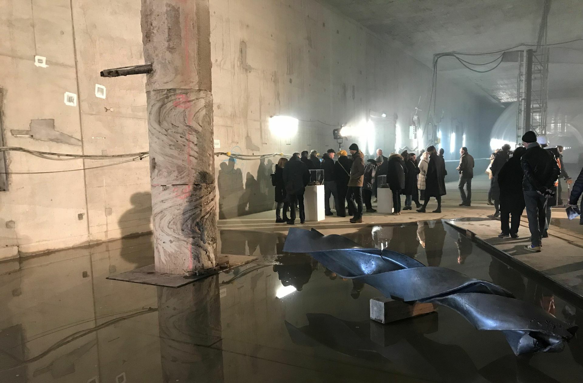 Rund 500 Meter führt der Kunst-Parcours durch den Untergrund; vom Rohbau der Bahnhofshalle geht es durch staubige Betontunnel, bis der kleine Zuschauer-Trupp über eine steile Treppe vom monströsen Lüftungsschacht ...