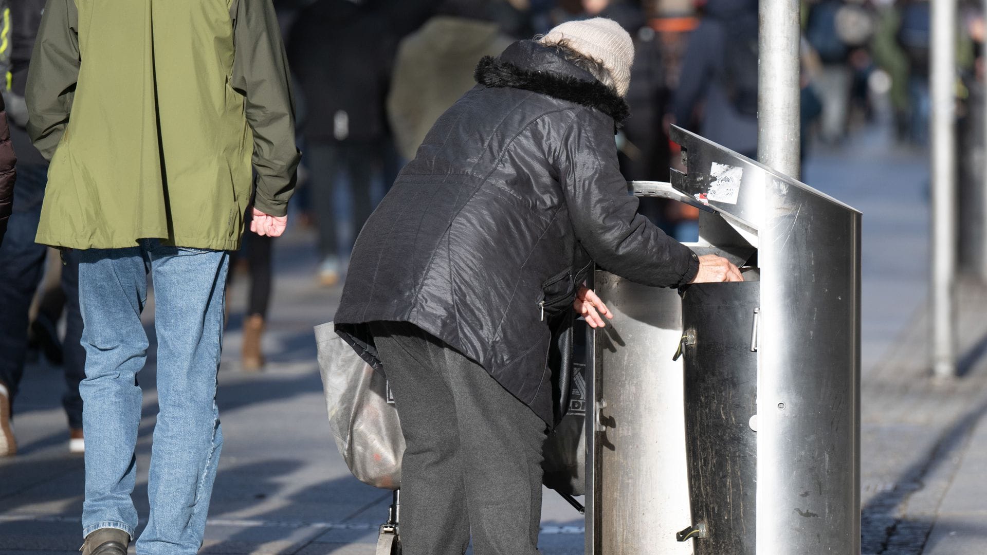 Eine ältere Frau sucht in einem Mülleimer nach Leergut.