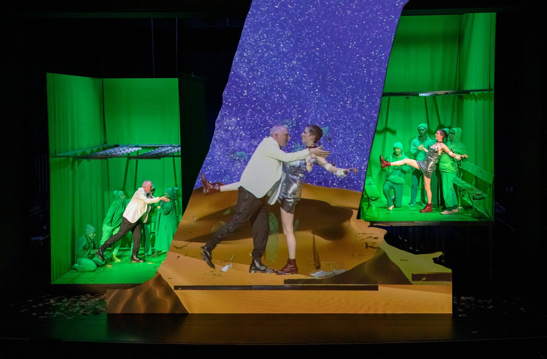 Stuttgart. Moby Dick ist riesig im Vergleich zu seinen Verfolgern. Bis zum oberen Rand des Bühnenportals erhebt sich die Silhouette des Wals. Moby Dick, das ist der Staat. Und die Walfänger im Boot – Kapitän Ahab, der Steuermann Starbuck und der Rest der Crew –, das sind die Terroristen der RAF. So plakativ das Bild, so eindrucksvoll ist es auch. Die Bühnenbildnerin Birgit Angele hat eine historische Illustration der Walfangszene ins Zentrum der Musiktheaterperformance „Hans und Grete“ gestellt. ...