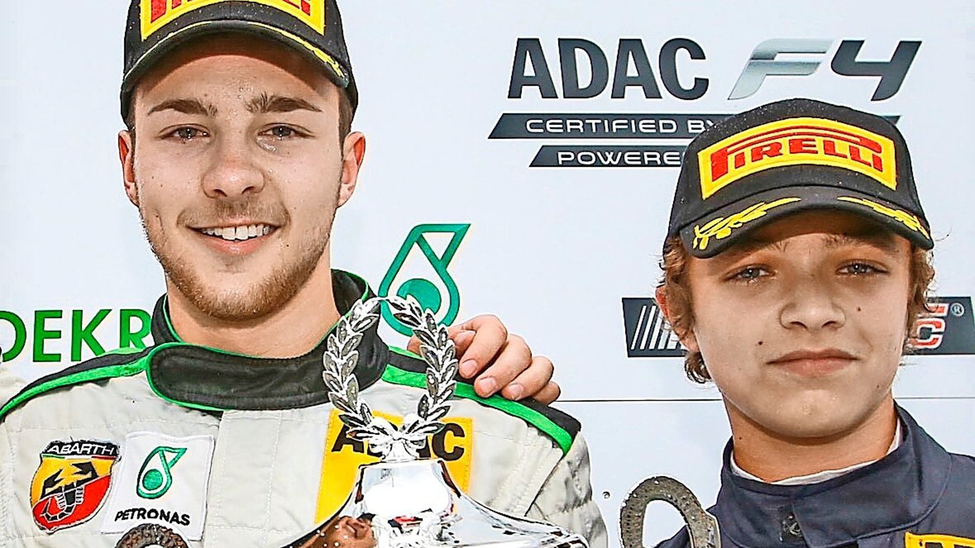 Marvin Dienst (links) und Lando Norris im August 2015 bei einer Siegerehrung der Formel 4 am Nürburgring.