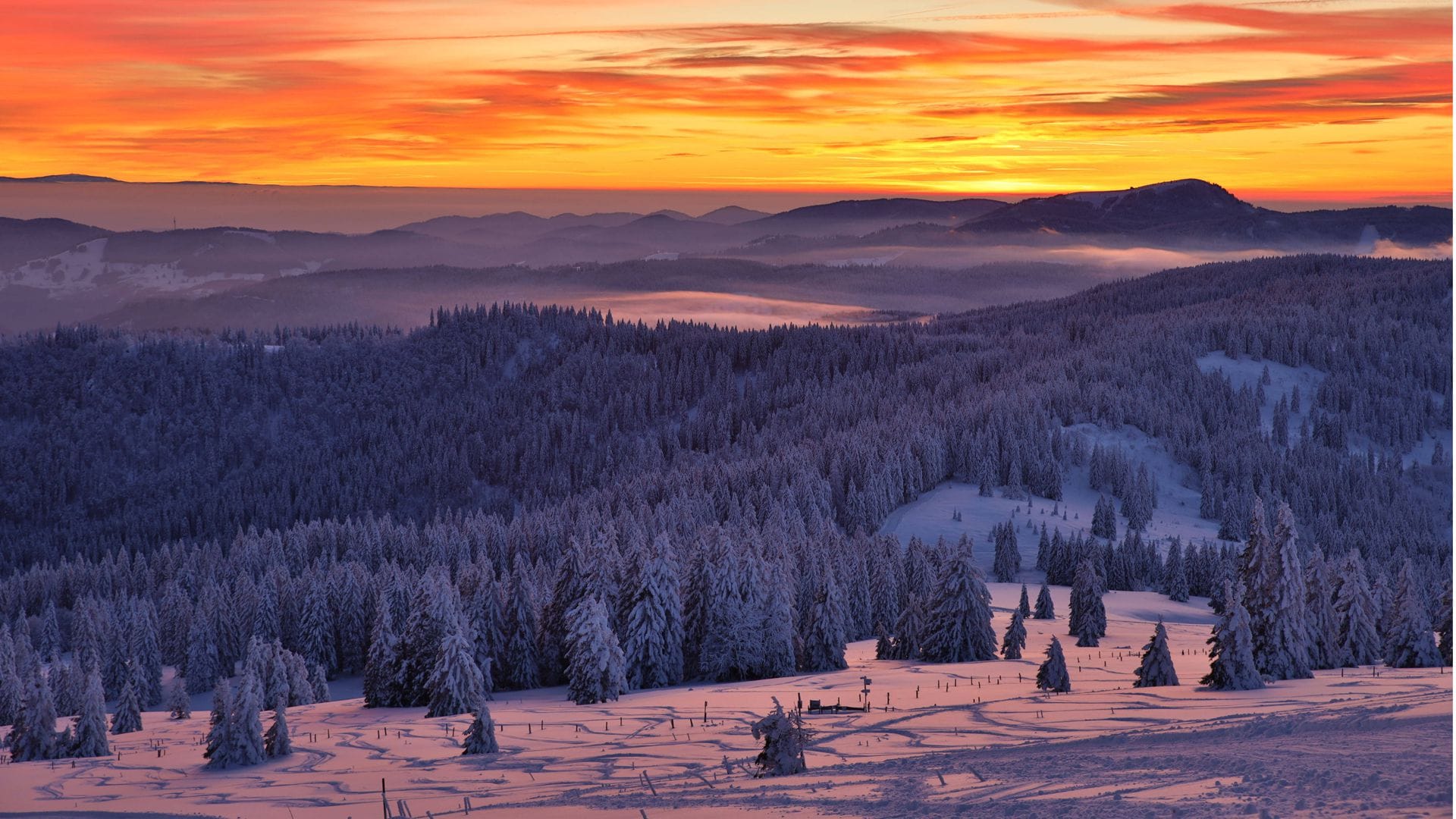 Blick vom Gipfel des Feldbergs Schwarzwald auf die untergehende Abendsonne.