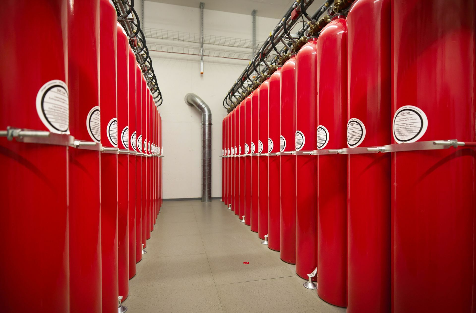 Im Brandfall wird Stickstoff aus diesen übermannsgroßen Flaschen in die betroffenen Abschnitte gepumpt – damit soll jedes Feuer schnell erstickt werden. Der gelagerte Stickstoff hat allein einen Wert von 100 000 Euro.