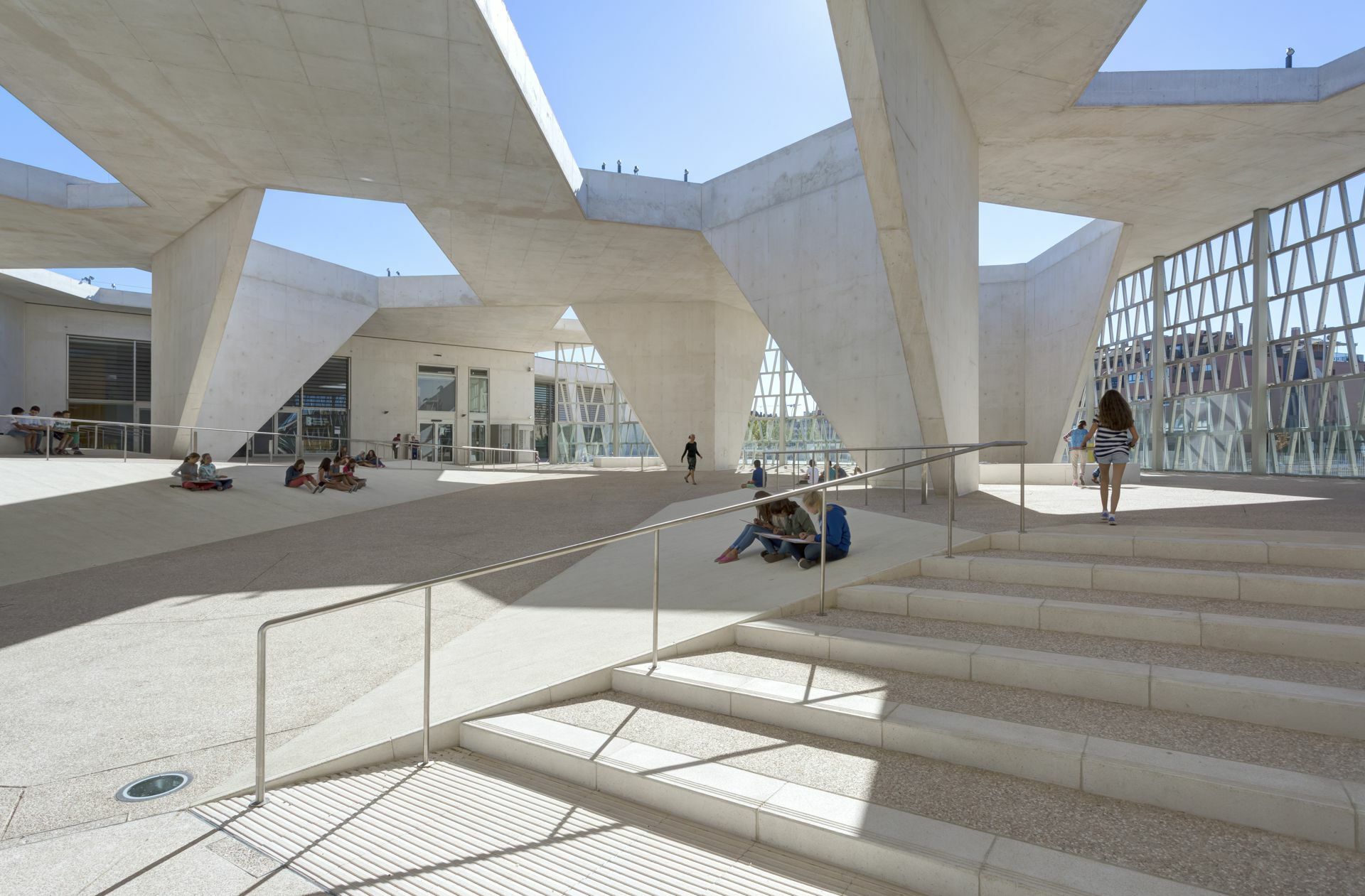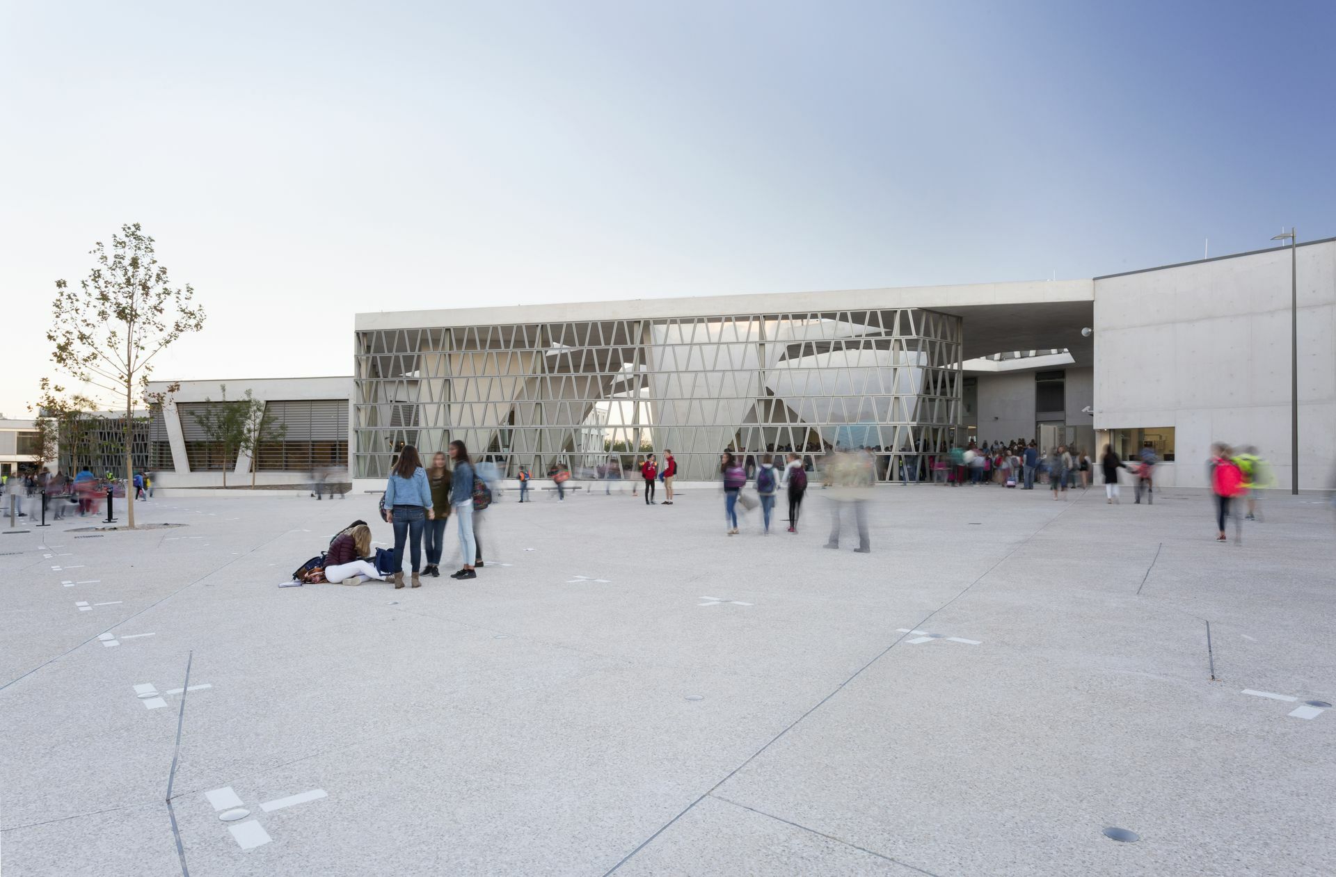 Die drei Hauptgebäude für Kindergarten, Grundschule und Gymnasium umschließen jeweils einen introvertierten Patio, der sich zur Landschaft der angrenzenden Sierra mit ihren schneebedeckten Bergen öffnet. Für das Ensemble gab es mehrere Preise, darunter den World Architecture Festival Winner, den Deutschen Architekturpreis 2017, den DAM-Preis 2017 Shortlist, den Balthasar Neumann Preis, den Iconic Award.