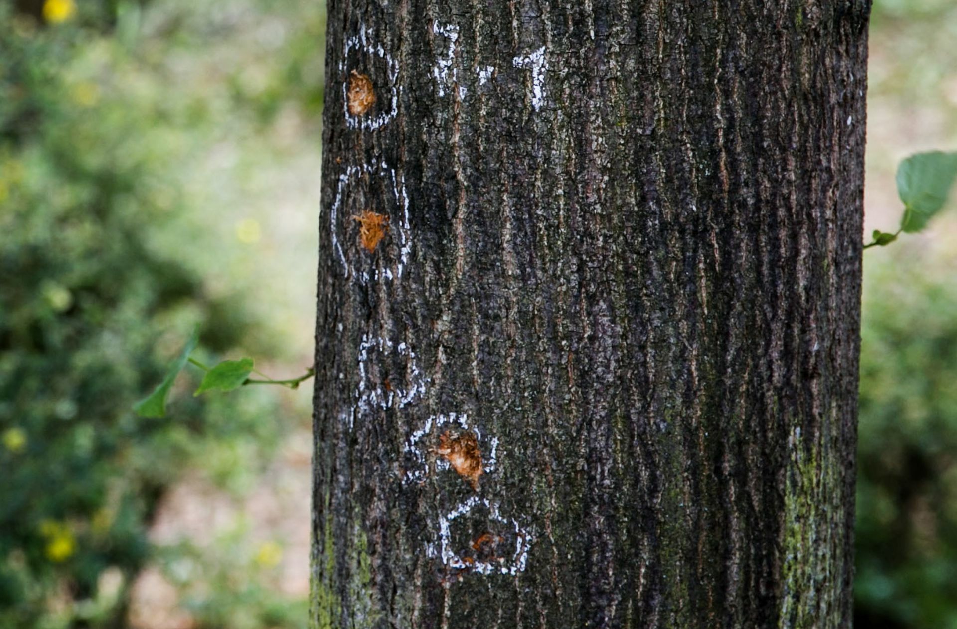 Einschlaglöcher einer Handgranate an einem Baum auf dem Altbacher Friedhof