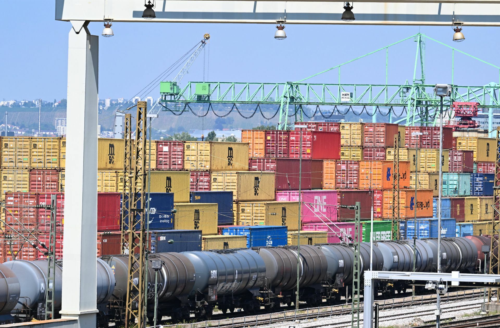 Frachtcontainer stapeln sich am Neckarhafen in Stuttgart. Logistikprobleme und steigende Energiekosten prägen unter anderem die düsteren Erwartungen der Firmenchefs im Ifo-Geschäftsklimaindex. Foto: dpa/Bernd Weißbrod
